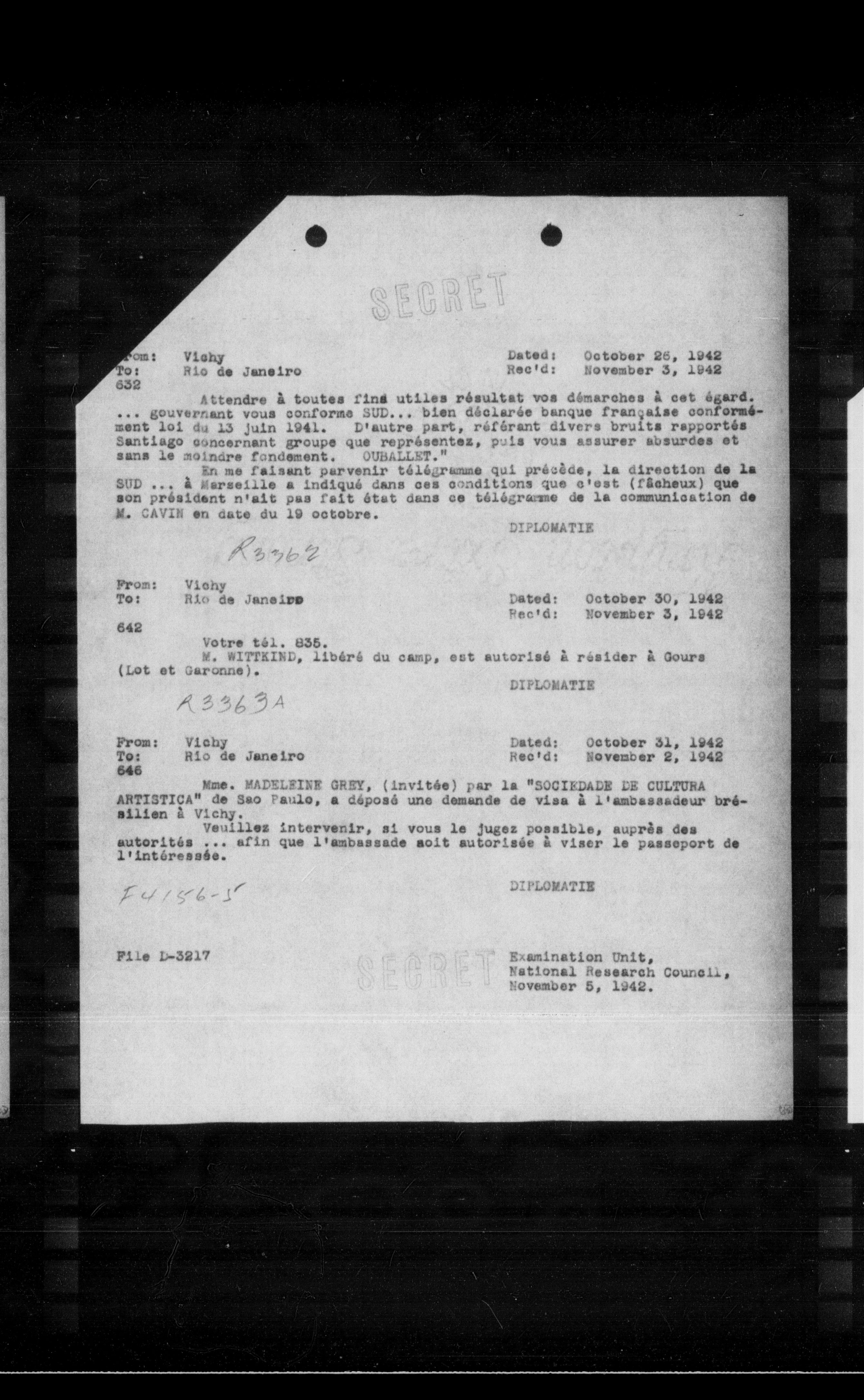 Attendre à toutes fins utiles résultat vos démarches à cet égard. ... gouvernant vous conforme SUD... bien déclarée banque française conformément loi du 13 juin 1941. D'autre part, référant divers bruits rapportés Santiago concernant groupe que représentez, puis vous assurer absurdes et sans le moindre fondement. **OUNAILLET.**