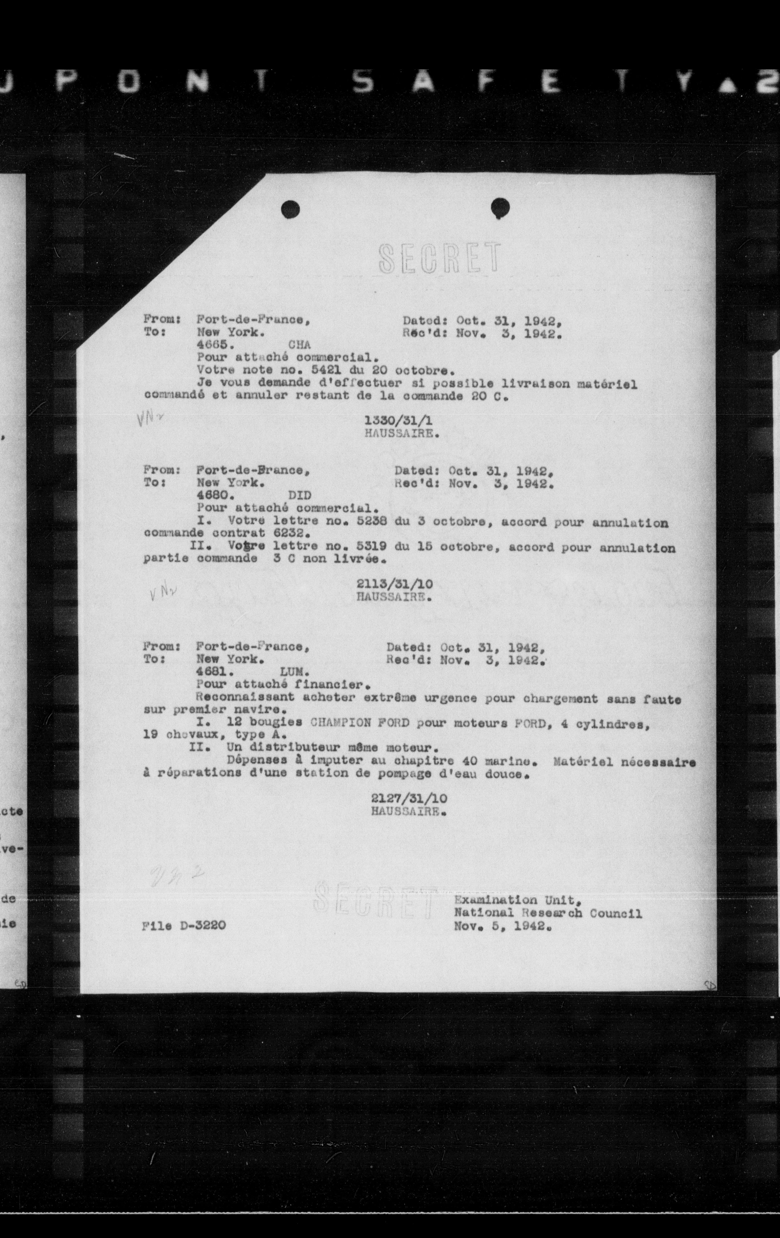 **From:** Fort-de-France, **Date:** Oct. 31, 1942, **To:** New York, **Reed:** Nov. 3, 1942, **CIN:** 4665, **CNA:** 4665, **CNA:** 4665, **CNA:** 4665