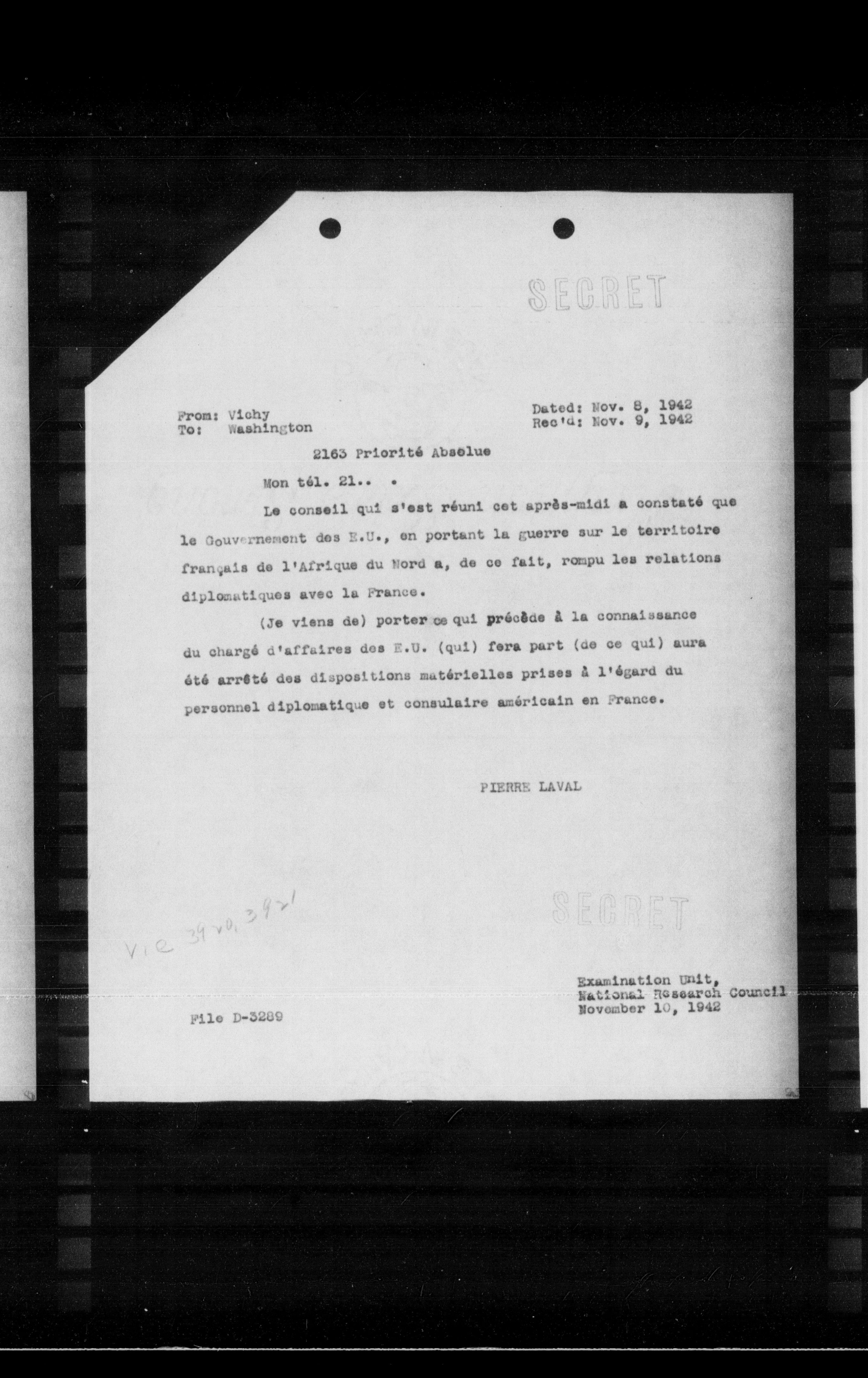 Le conseil qui s'est réuni cet après-midi a constaté que le Gouvernement des E.U., en portant la guerre sur le territoire français de l'Afrique du Nord a, de ce fait, rompu les relations diplomatiques avec la France.
