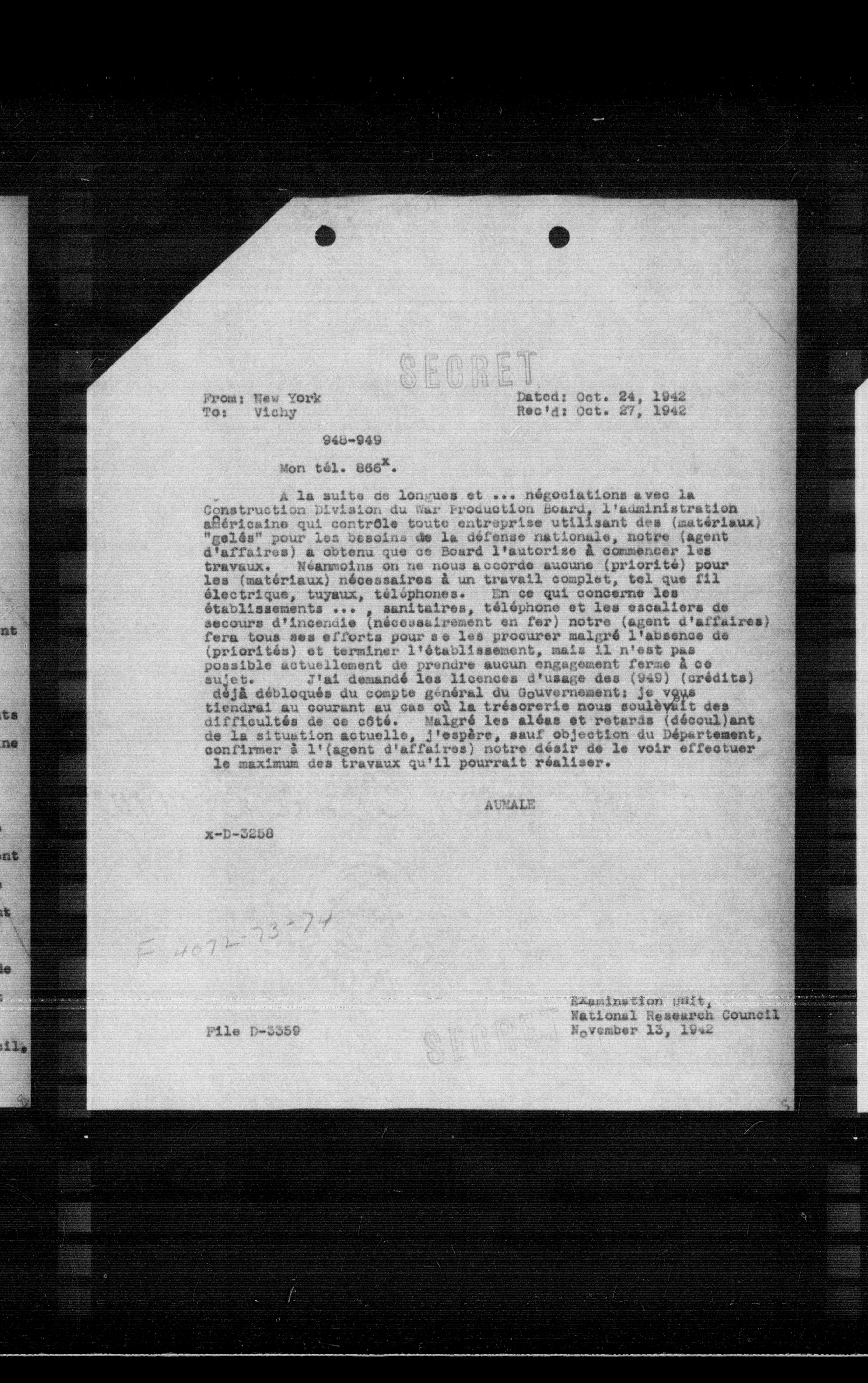 **From:** New York **To:** Vichy **Date:** Oct. 24, 1942 **Rec'd:** Oct. 27, 1942