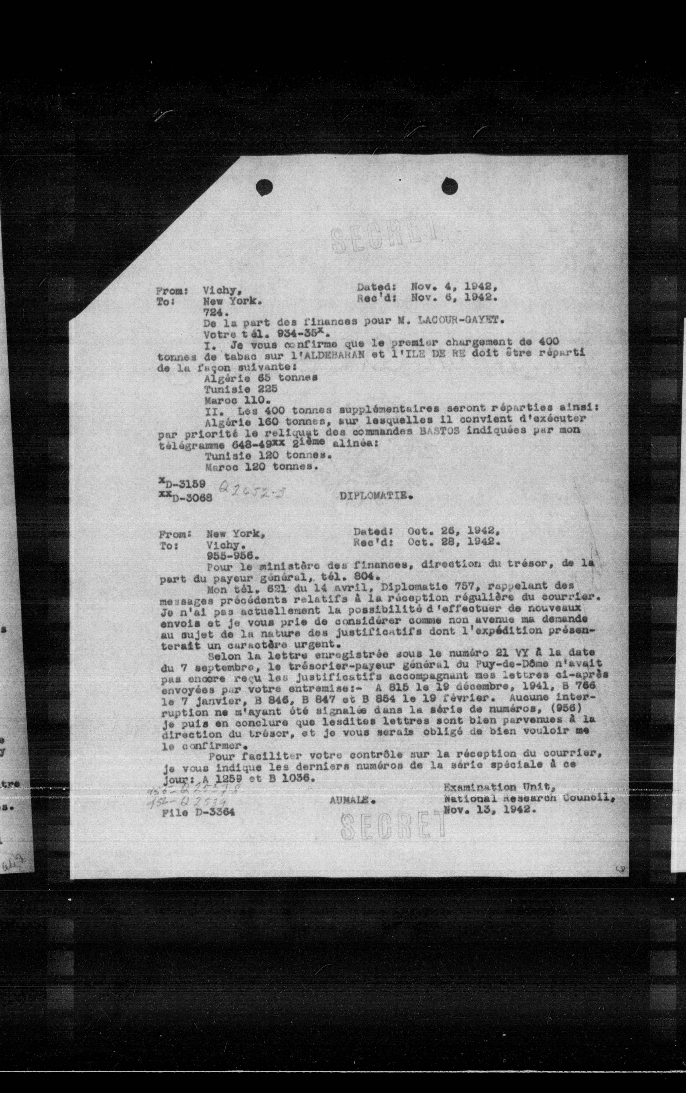 - From: Vichy, Date: Nov. 4, 1942, To: New York. Rec'd: Nov. 6, 1942. 724. De la part des finances pour M. LAGOUR-GAYET. Votre tél. 934-352. I. Je vous confirme que le premier chargement de 400 tonnes de tabac sur l'ALDENAHAN et l'ILE DE RE doit être réparti de la façon suivante: Algérie 65 tonnes Tunisie 235 Maroc 110. II. Les 400 tonnes supplémentaires seront réparties ainsi: Algérie 160 tonnes, sur lesquelles il convient d'exécuter par priorité le reliquat des commandes BASTOS Indiquées par mon télégramme 648-49XX glême alinéa: Tunisie 120 tonnes. Maroc 120 tonnes. XD-3159 XR-D-3068 DIPLOMATIE.