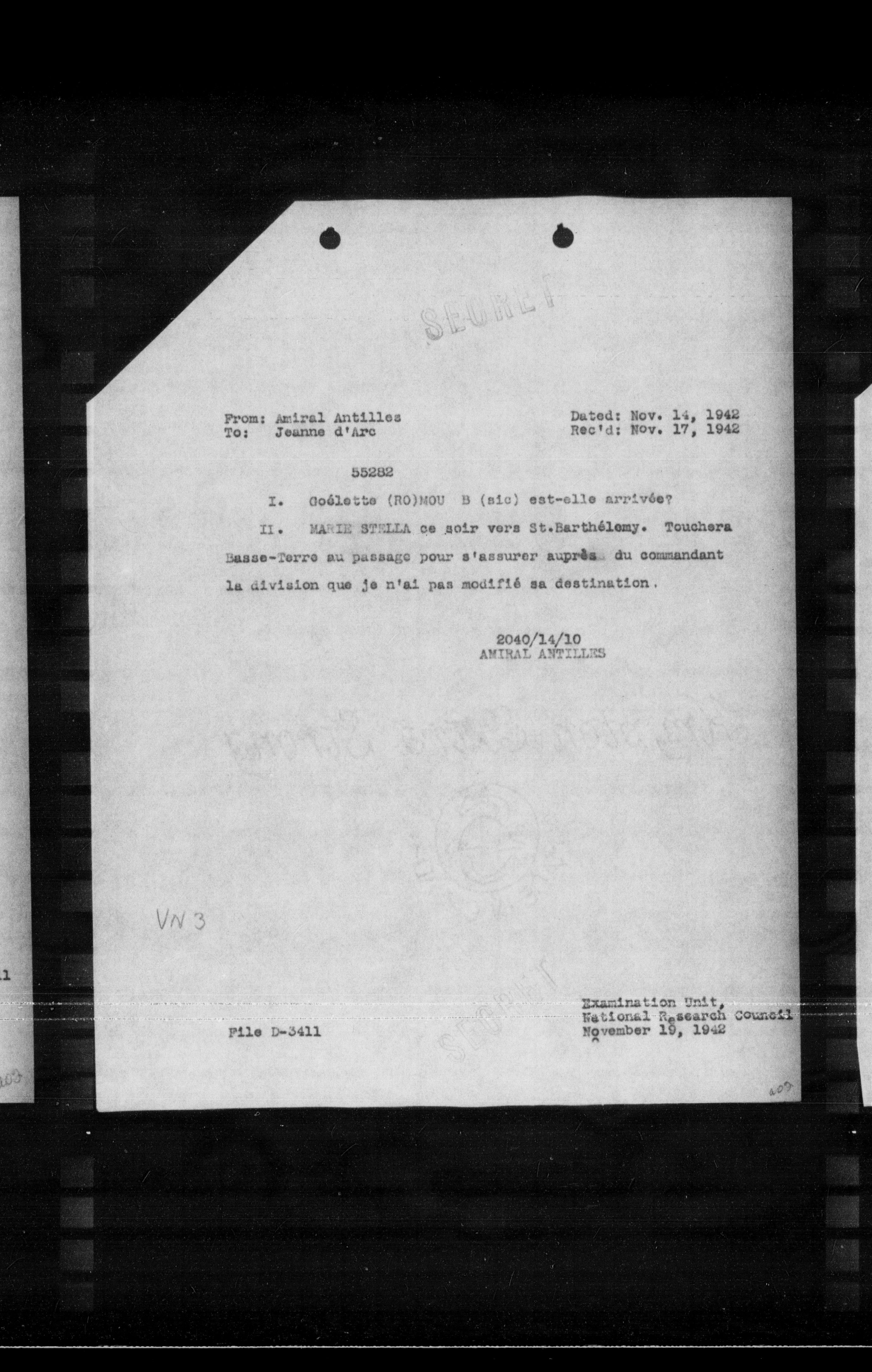 II. MAIRE STELLA se soir vers St-Barthélemy. Touchera Basse-Terre au passage pour s'assurer auprès du commandant la division que je n'ai pas modifié sa destination.