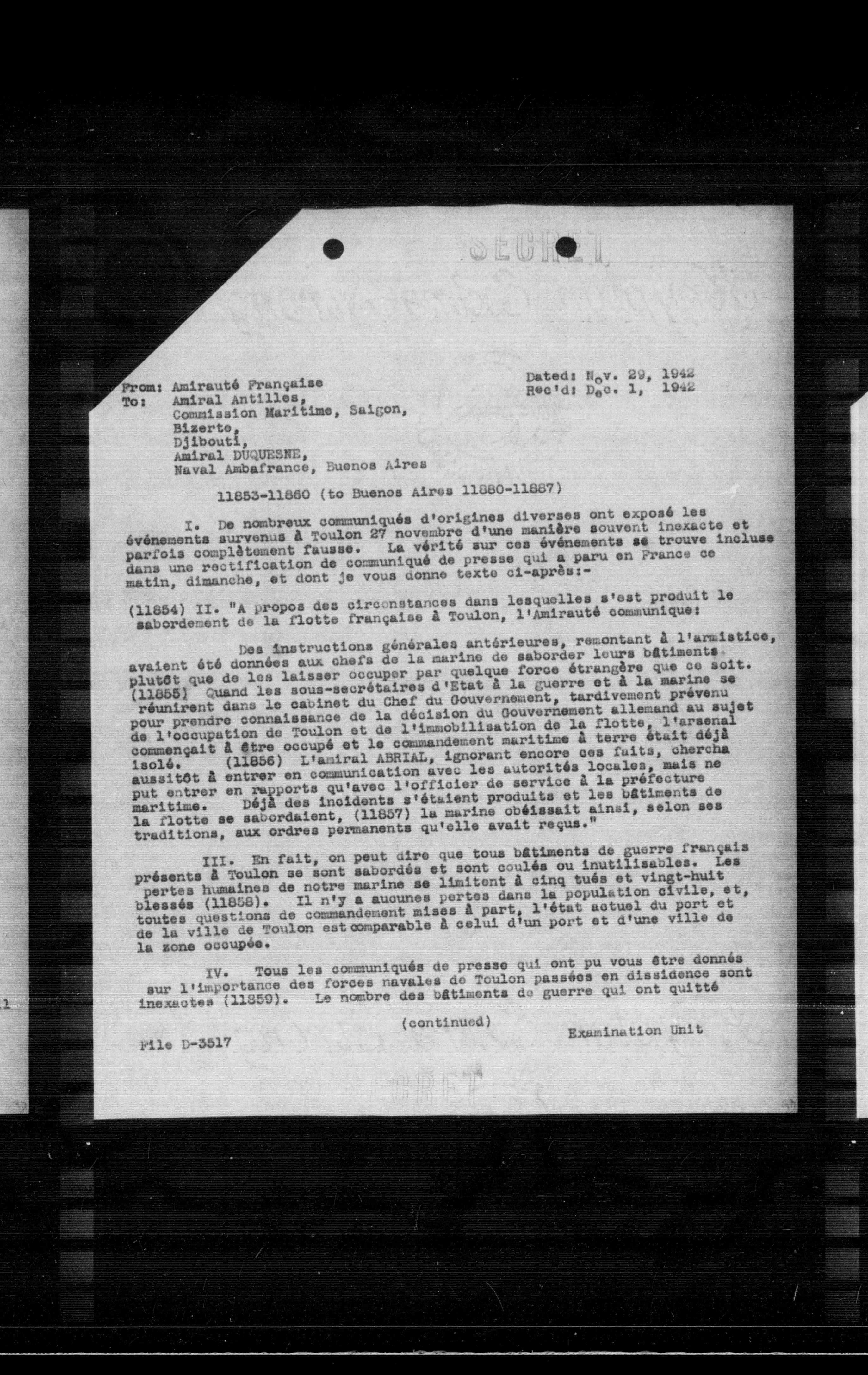 III. En fait, on peut dire que tous bâtiments de guerre français présents à Toulon se sont sabordés et sont coulés ou inutilisables. Les pertes humaines de notre marine se limitent à cinq tués et vingt-huit blessés (11858). Il n'y a aucune perte dans la population civile, et toutes questions de commandement mises à part, l'état actuel du port et de la ville de Toulon est comparable à celui d'un port et d'une ville de la zone occupée.