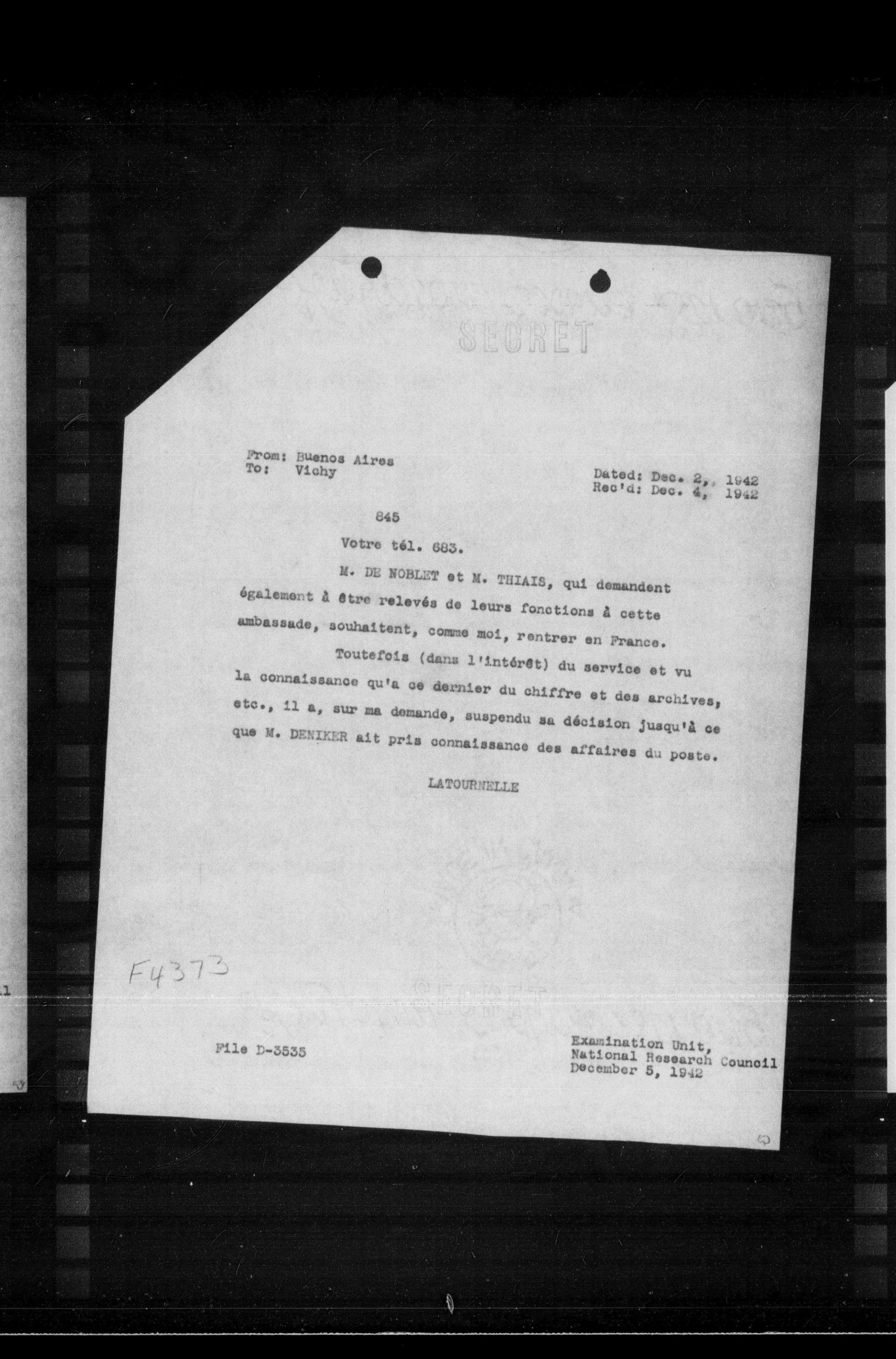 M. DE NOBLET et M. THIAIS, qui demandent également à etre relevés de leurs fonctions à cette ambassade, souhaitent, comme moi, rentrer en France.