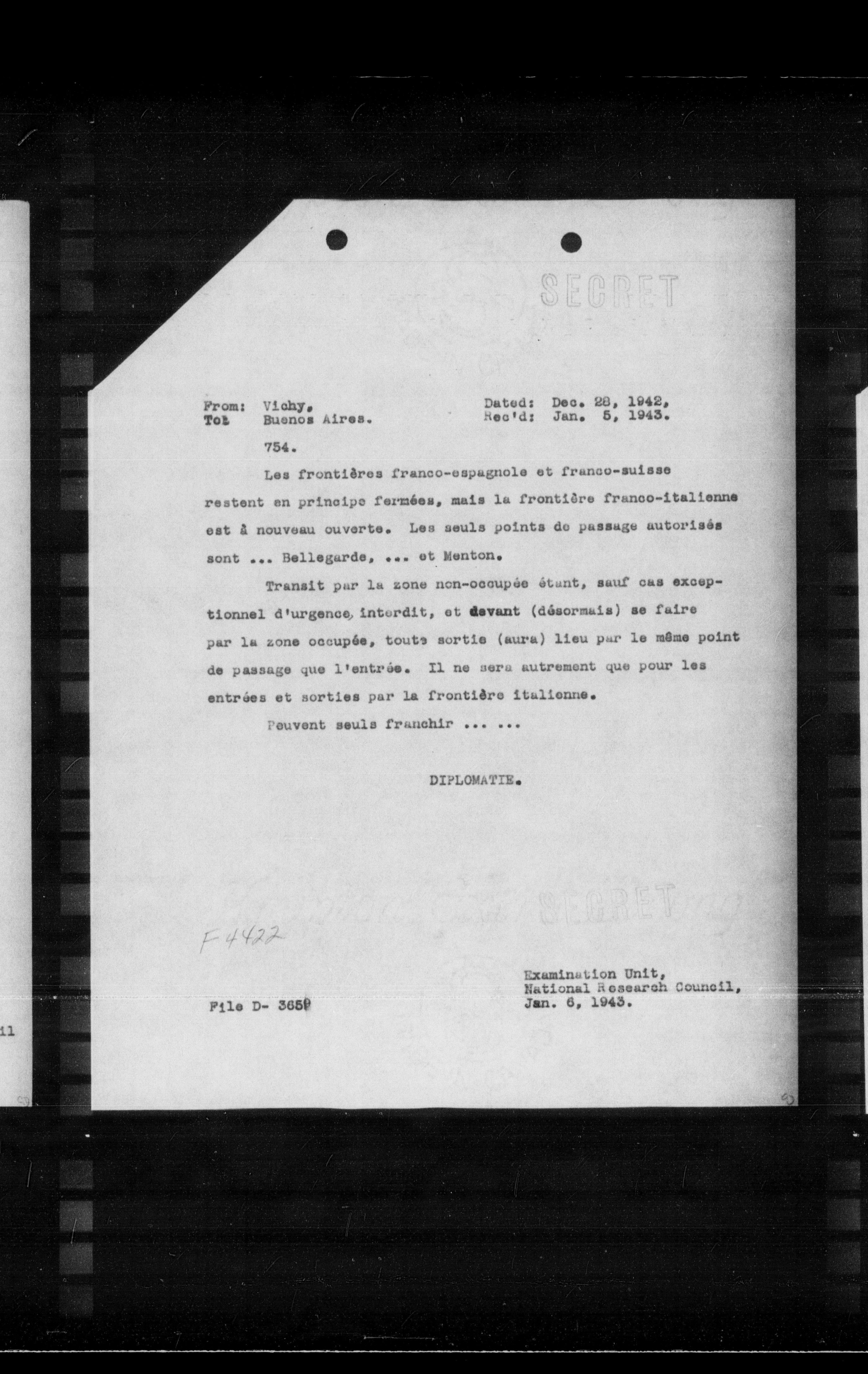 - From: Vichy, Dated: Dec. 28, 1942, To: Buenos Aires. Reo'd: Jan. 5, 1943. 754 .