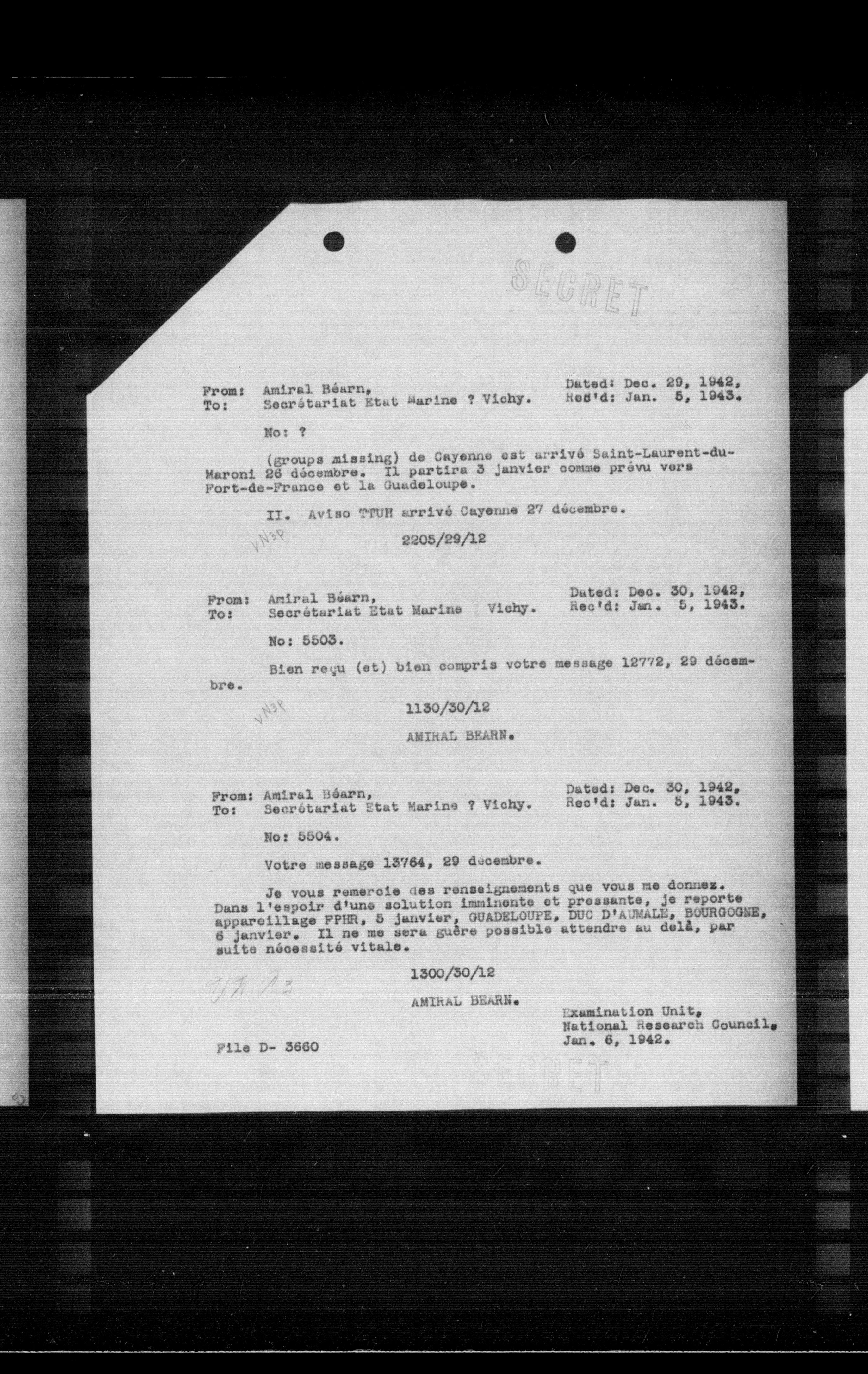 **From:** Amiral Béarn, **To:** Secrétariat Etat Marine ? Vichy. **Date:** Dec. 30, 1942, **Rec'd:** Jan. 5, 1943.