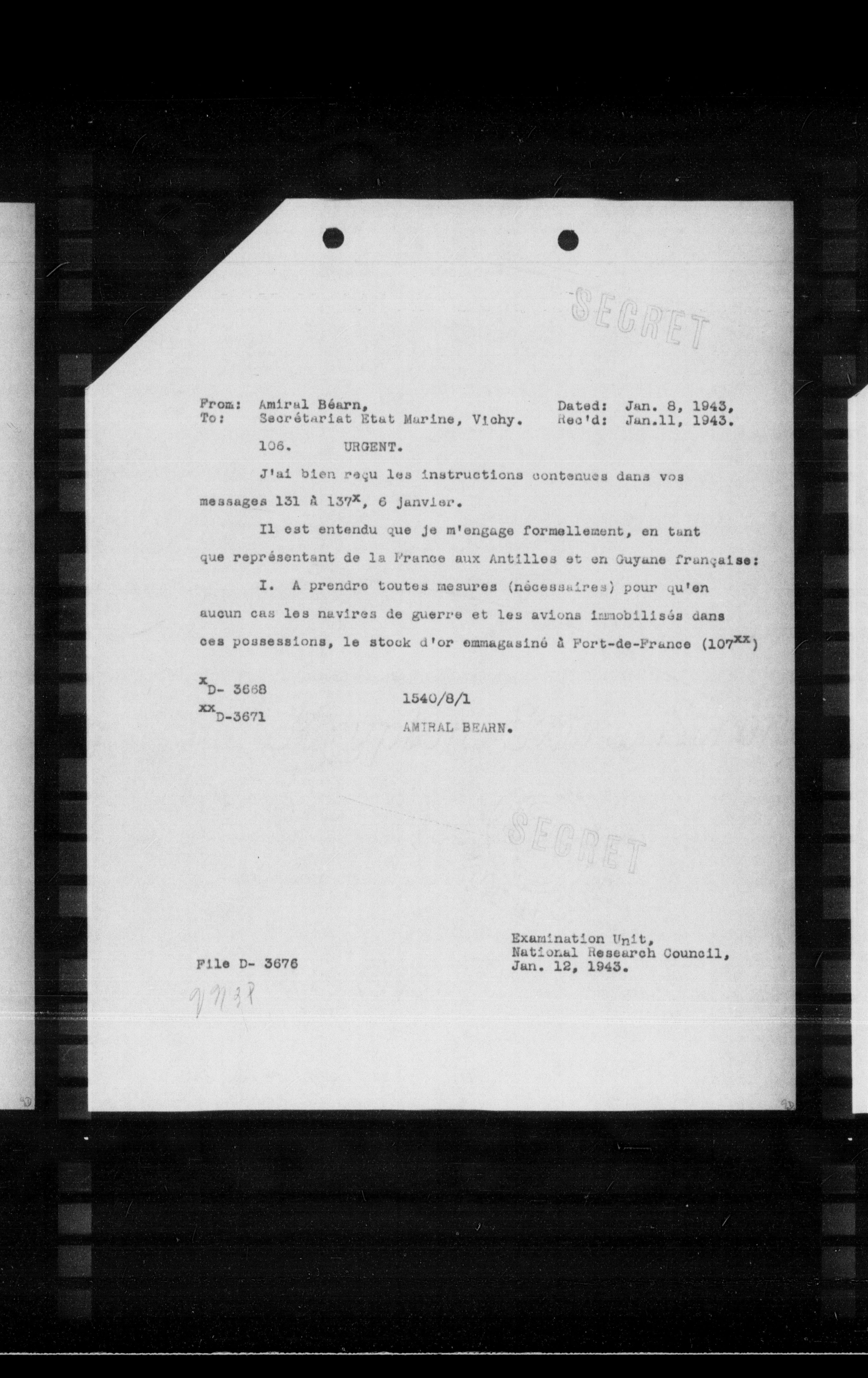 - From: Amiral B6arn, Dated: Jan. 8, 1943, To: Sacratariat Etat Marine, Vichy. Reo'd: Jan.11, 1943. 106. URGENT.