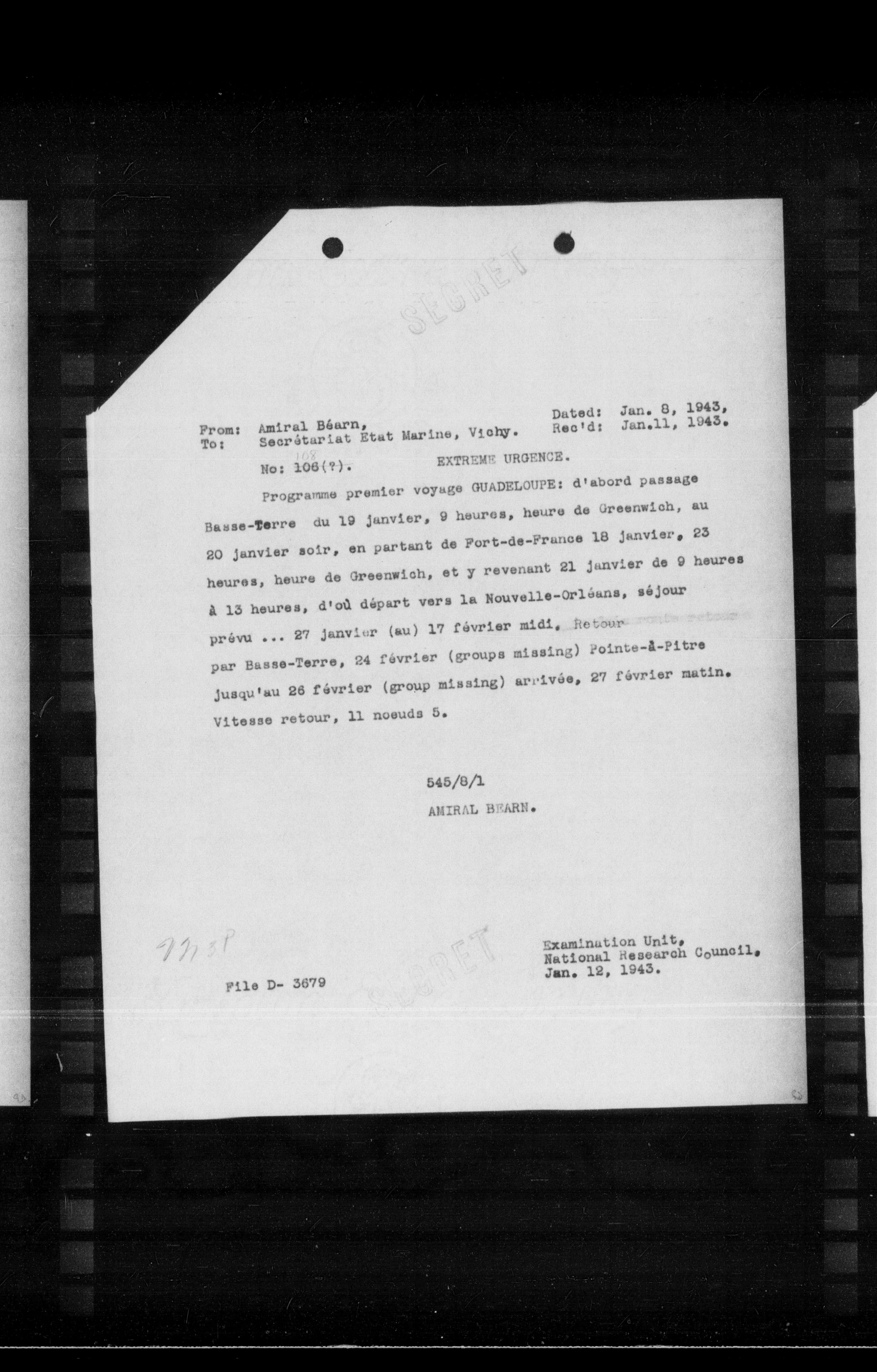 - From: Amiral Béarn, To: Secretariat État Marine, Vichy. Ree'd: Jan. 8, 1943, Reo'd: Jan.11, 1943.