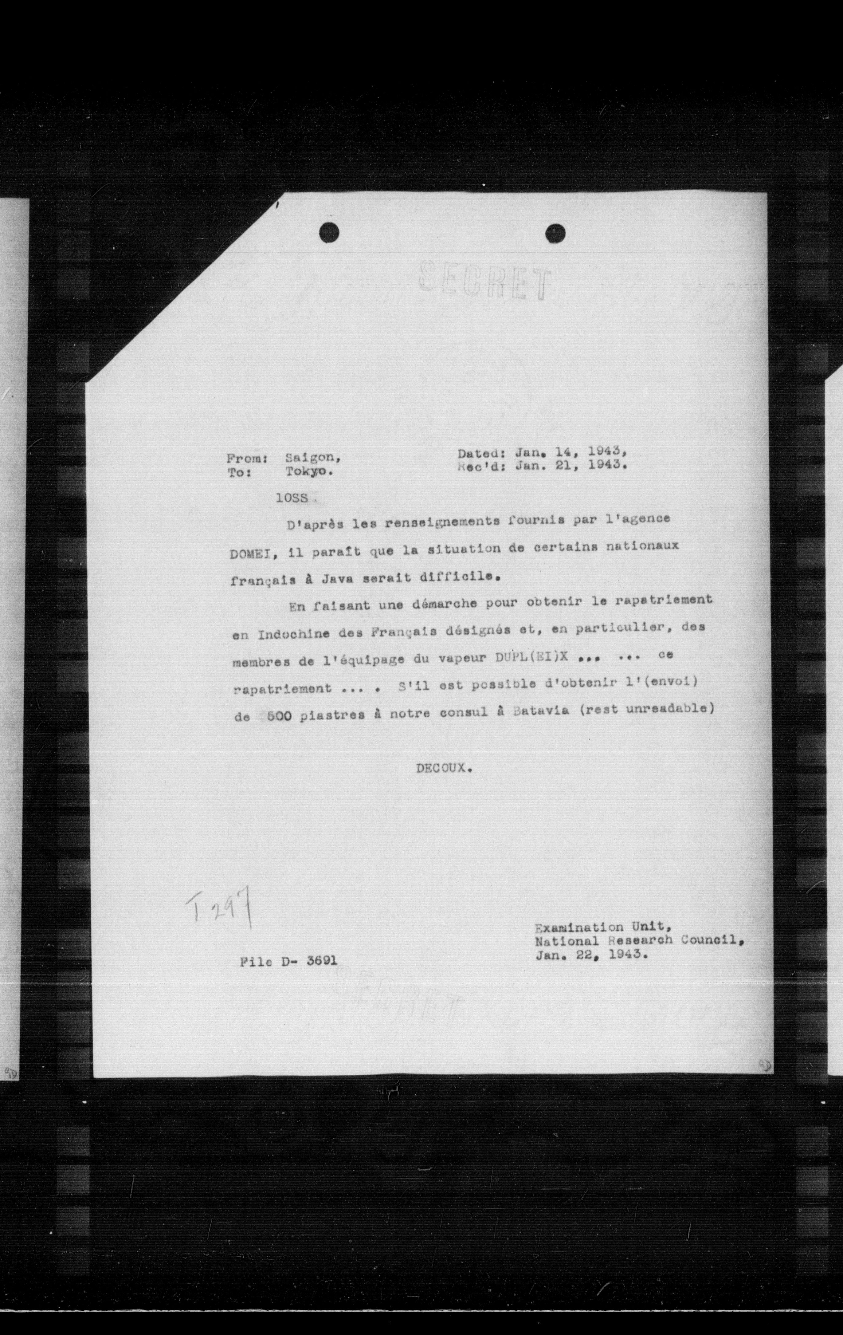 - From: Saigon, Date: Jan. 14, 1943, To: Tokyo. Rec'd: Jan. 21, 1943.