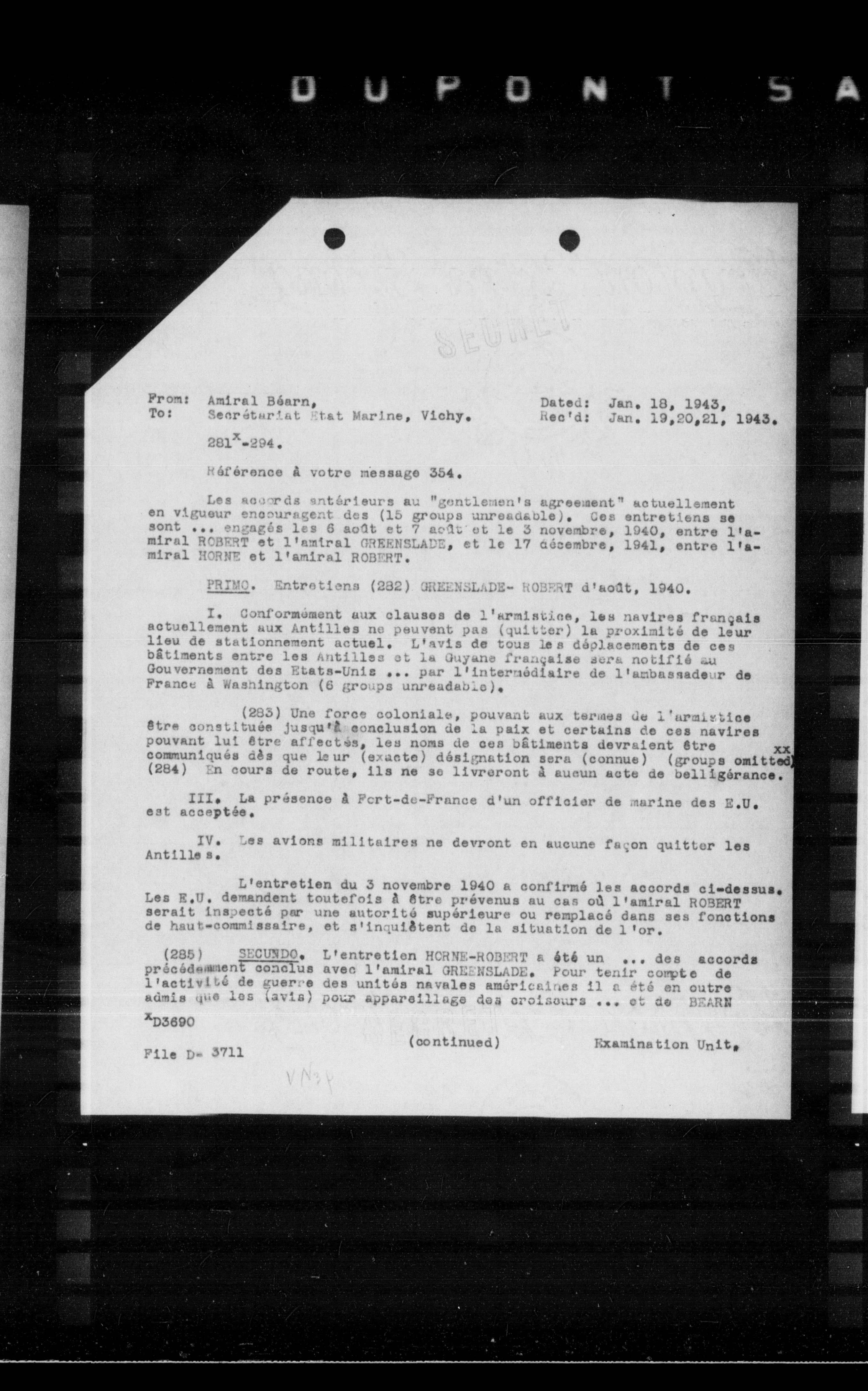 Les acoords antérieurs au "gentlemen's agreement" actuellament en vigueur enearragent des ( 15 groups unreadable). Ces entretiens se sont ... engagés les 6 aout et 7 aout et le 3 novembre, 1940, entre l'amiral ROBERT et l'amiral GREENBLADE, et le 17 décembre, 1941, entre l'amiral HORNE et l'amiral ROBERT.