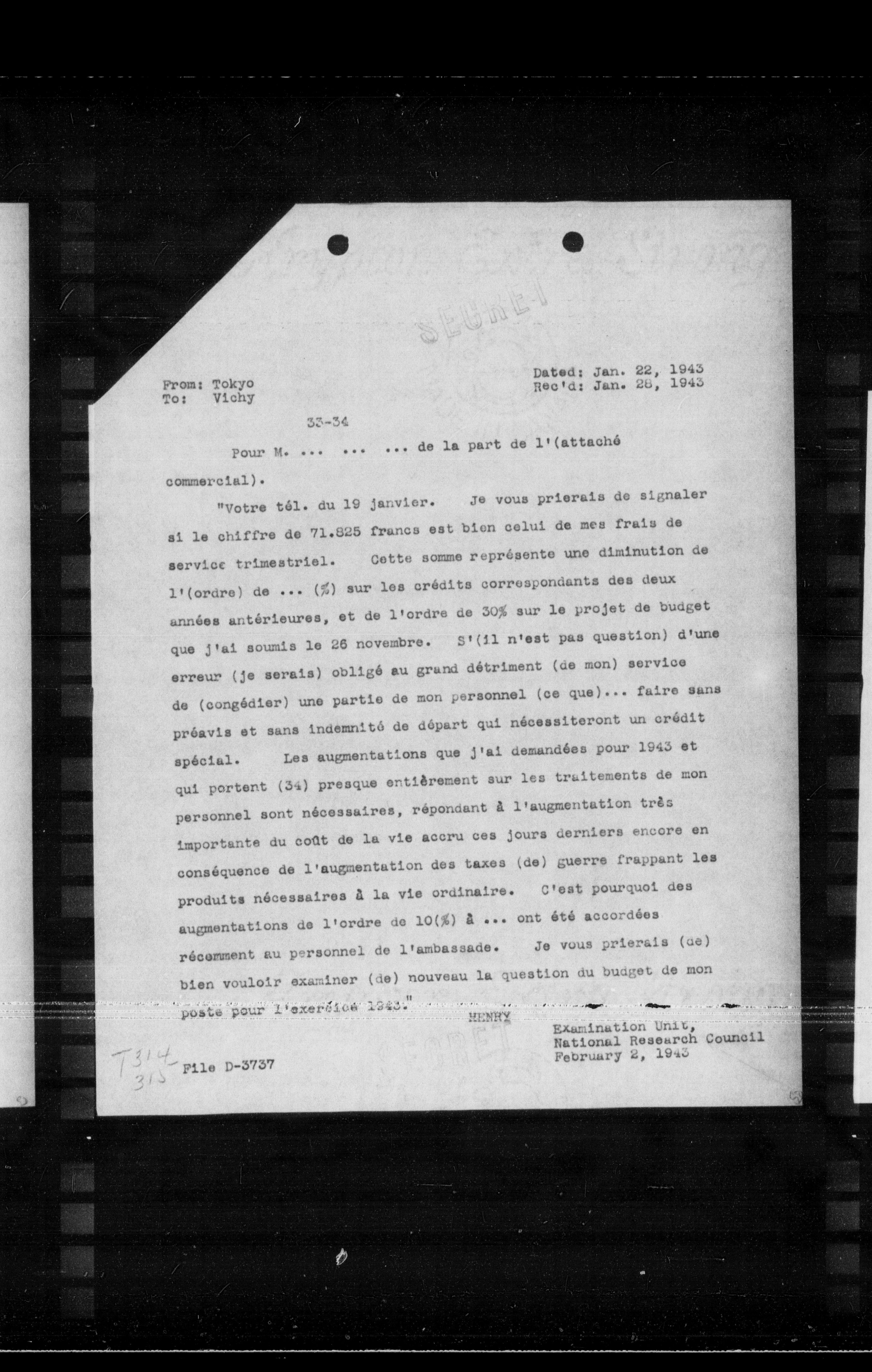 "Votre tôl. du 19 janvier. Je vous prierals de signaler si le chiffre de 71.025 francs est blen celui de mes frais de service trimestriel. Cette somme représente une diminution de 1'(ordre) de ... (\%) sur les crédits correspondants des deux années antérieures, et de l'ordre de $30 \%$ sur le projet de budget que j'ai soumis le 26 novembre. S'(il n'est pas question) d'une erreur (je serais) obligé au grand détriment (de mon) service de (congédier) une partie de mon personnel (ce que)... faire sans préavis et sans indemnité de départ qui nécessiteront un crédit spécial. Les augmentations que j'ai demandées pour 1943 et qui portent (34) presque entièrement sur les traitements de mon personnel sont nécessaires, répondant à l'augmentation très importante du coût de la vie accru ces jours derniers encore en conséquence de l'augmentation des taxes (de) guerre frappant les produits nécessaires à la vie ordinaire. C'est pourquoi des augmentations de l'ordre de $10(\%)$ à ... ont été accordées récemment au personnel de l'ambassade. Je vous prierais (ce) bien vouloir examiner (de) nouveau la question du budget de mon poste pour l'exerćice 1943."