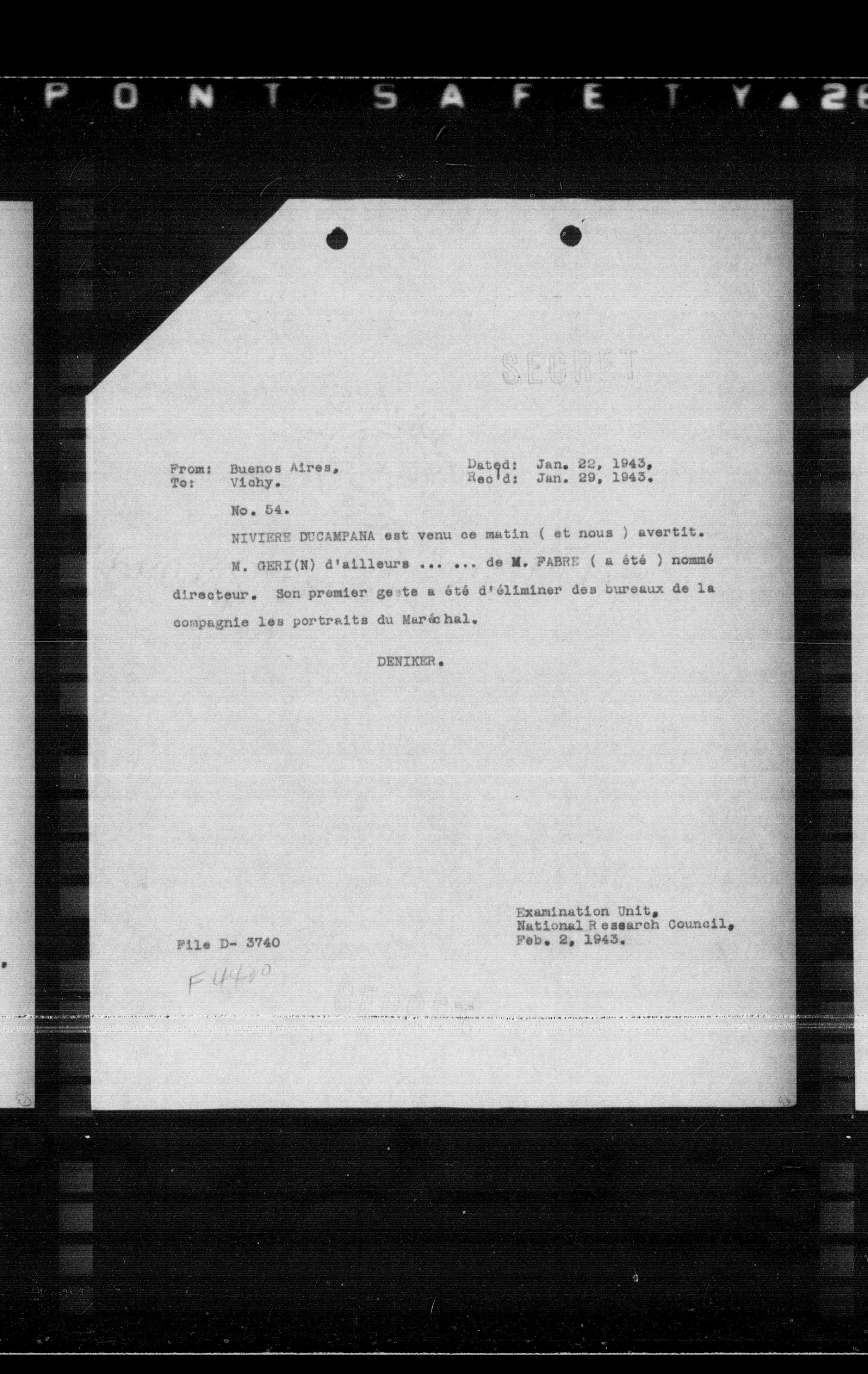 To: Vichy. Rec'd: Jan. 29, 1943.