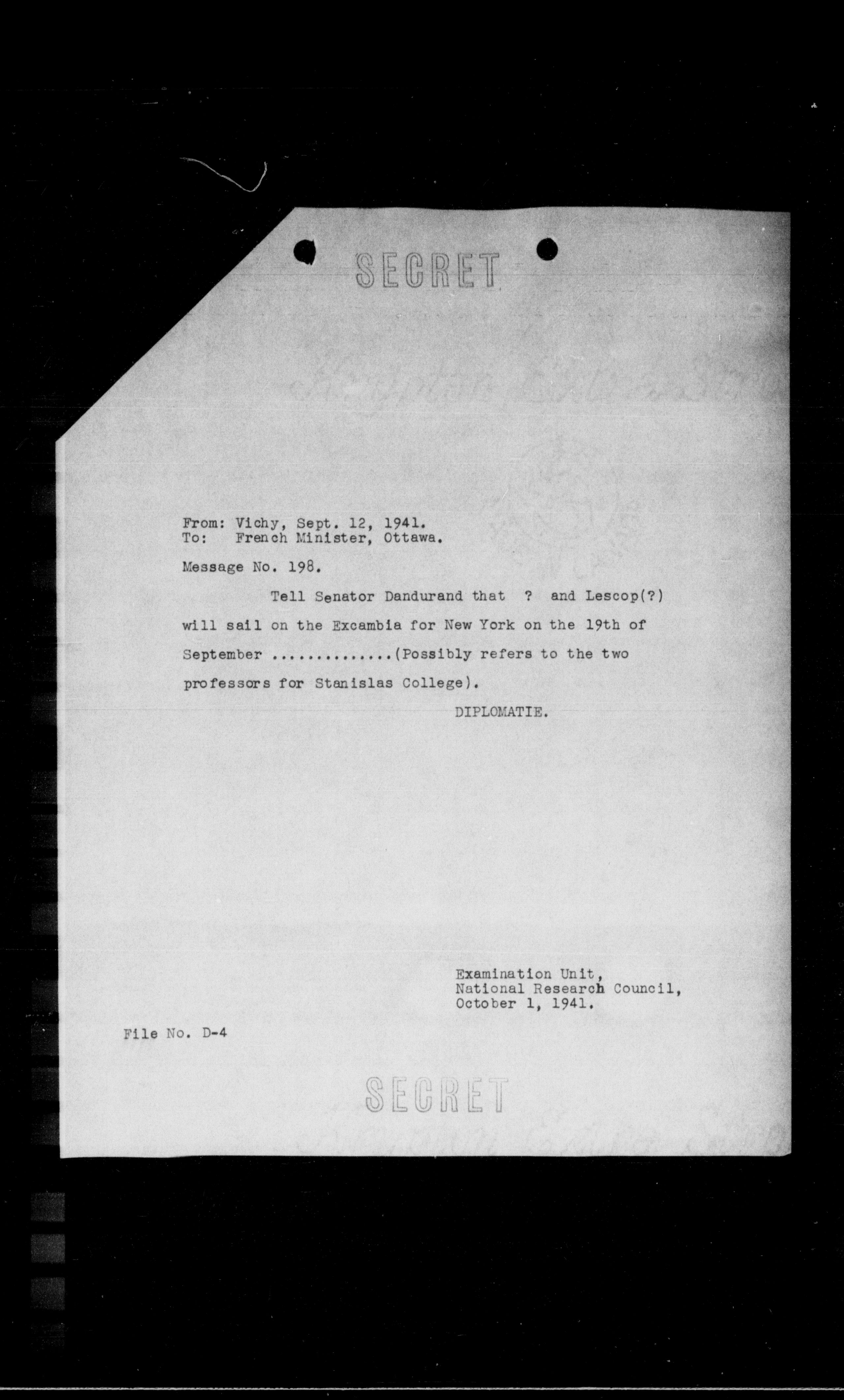 Tell Senator Dandurand that ? and Lescop(?) will sail on the Exeambla for New York on the 19th of September ............(Possibly refers to the two professors for Stanislas College).