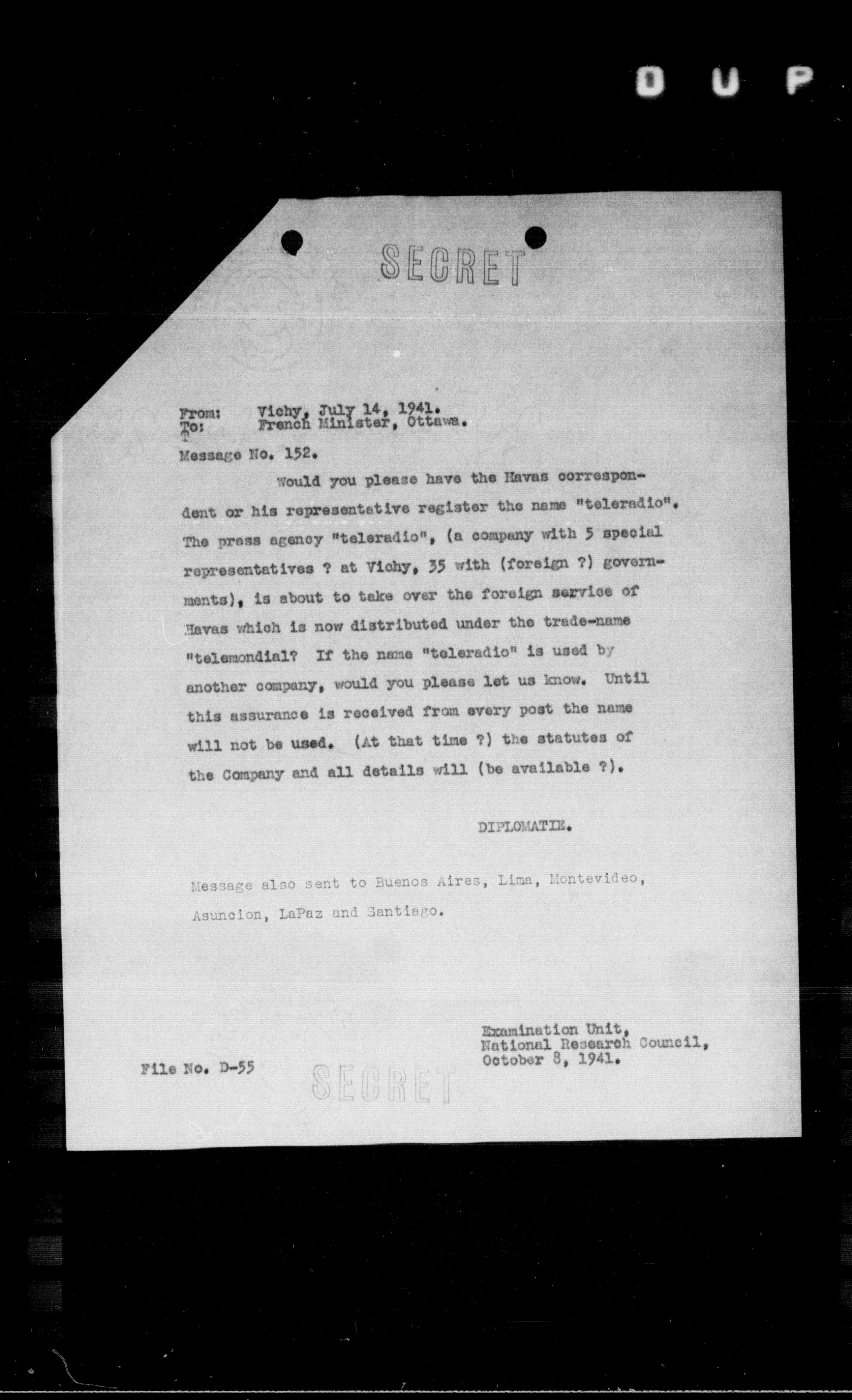 Would you please have the Havas correspondent or his representative register the name "teleradio". The press agency "teleradio", (a company with 5 special representatives ? at Vichy, 35 with (foreign ?) governments), is about to take over the foreign service of Havas which is now distributed under the trade-name "telemondial"? If the name "teleradio" is used by another company, would you please let us know. Until this assurance is received from every post the name will not be used. (At that time ?) the statutes of the Company and all details will (be available ?).