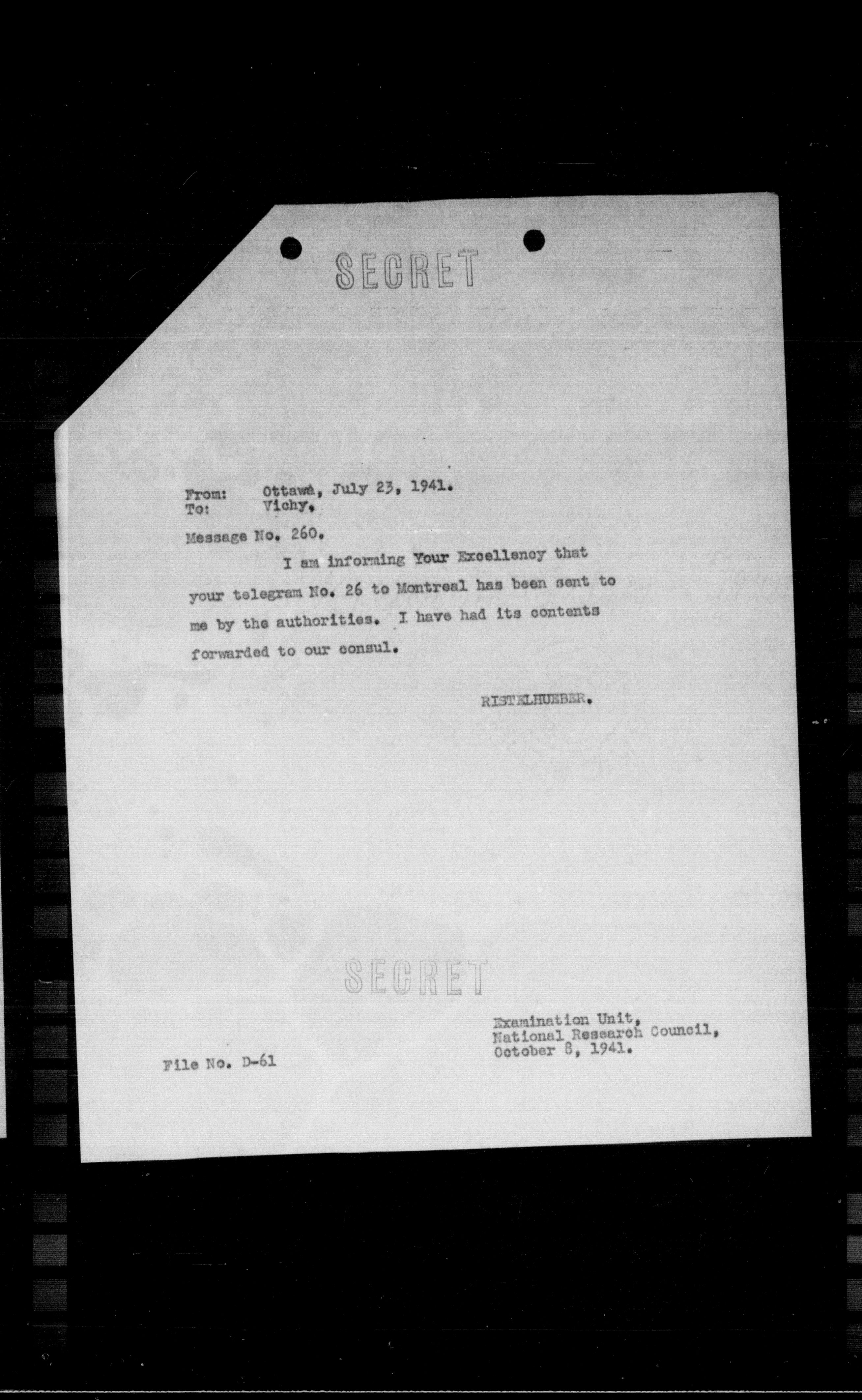 I am informing Your Excellency that your telegram No. 26 to Montreal has been sent to me by the authorities. I have had its contents forwarded to our consul.
