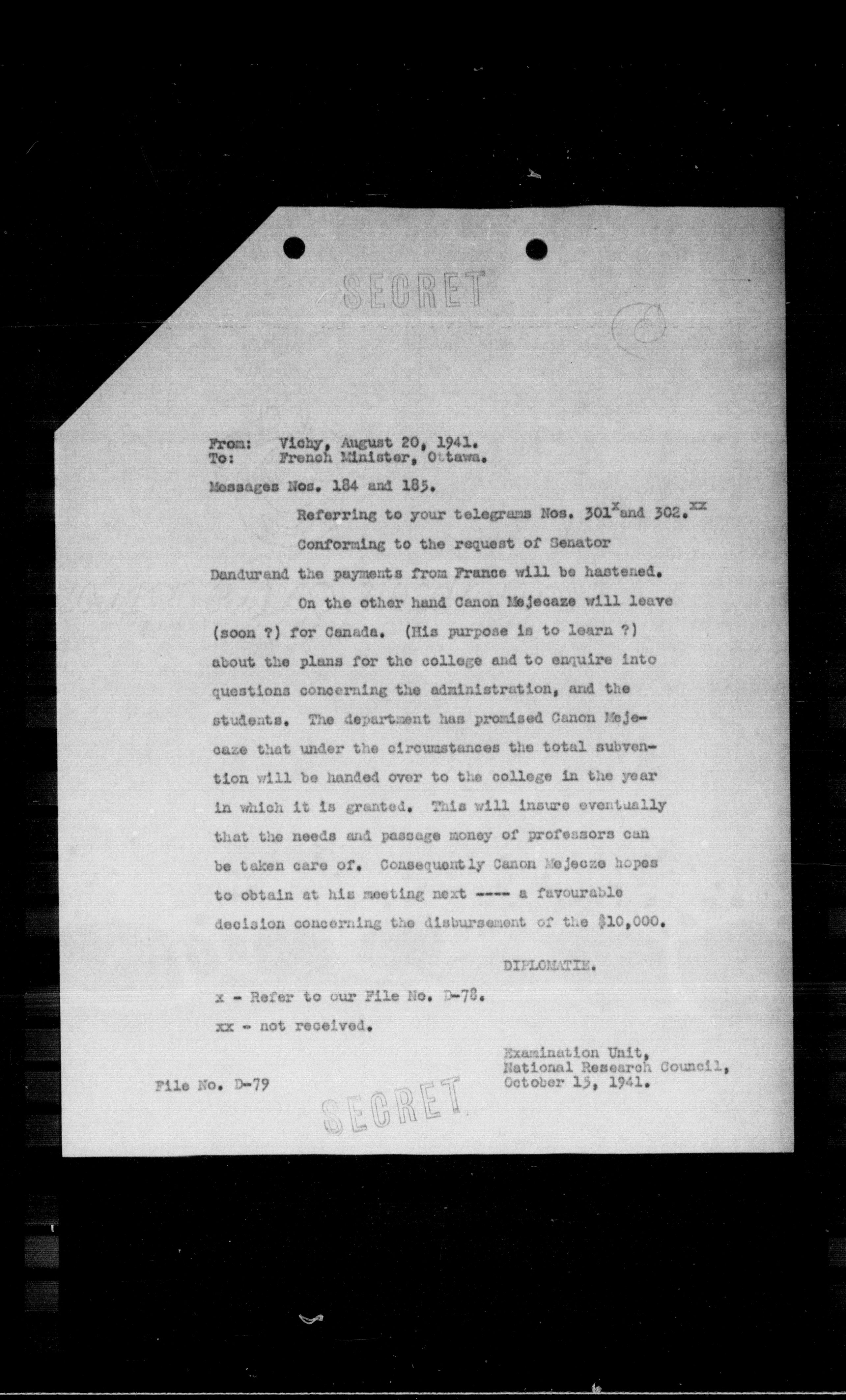 On the other hand Canon Mejecaze will leave (soon ?) for Canada. (His purpose is to learn ?) about the plans for the college and to enquire into questions concerning the administration, and the students. The department has promised Canon Mejecaze that under the circumstances the total subvention will be handed over to the college in the year in which it is granted. This will insure eventually that the needs and passage money of professors can be taken care of. Consequently Canon Mejecaze hopes to obtain at his meeting next --- a favourable decision concerning the disbursement of the $10,000.