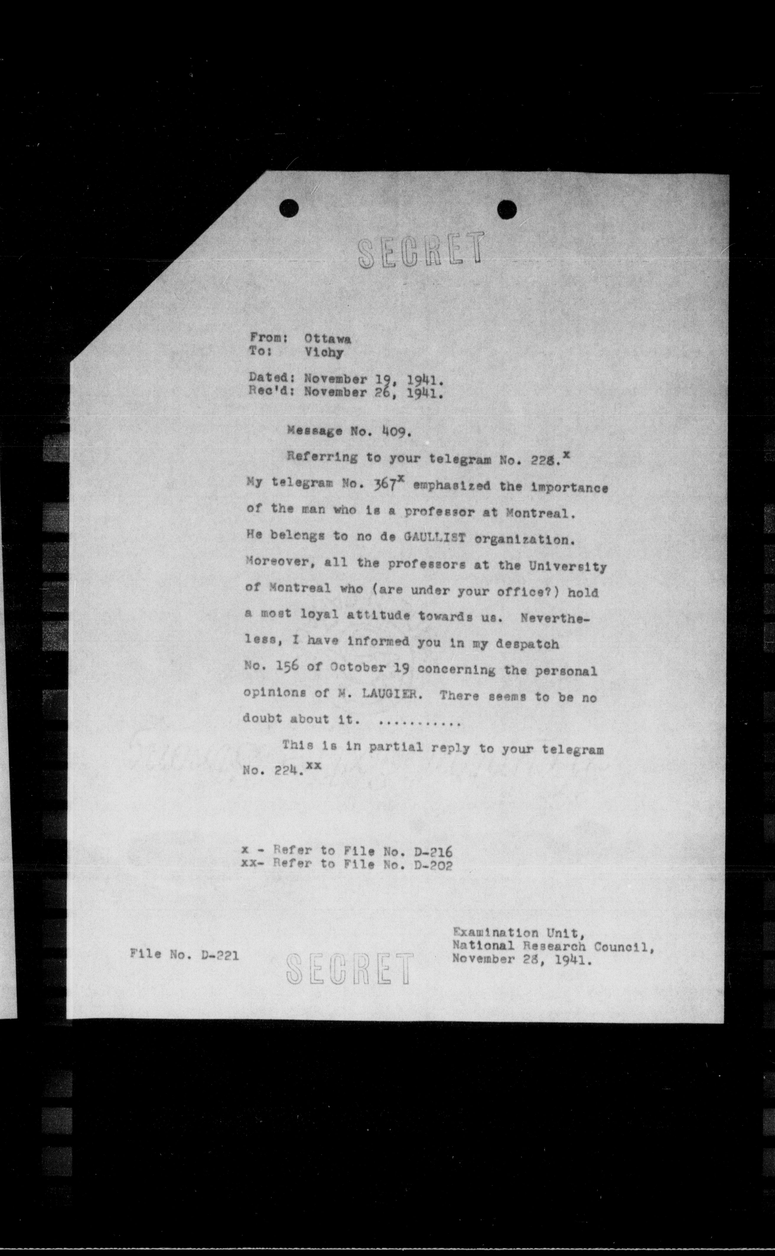 My telegram No. 367x emphasized the importance of the man who is a professor at Montreal. He belongs to me de GAULLIST organization. Moreover, all the professors at the University of Montreal who (are under your office?) hold a most loyal attitude towards us. Nevertheless, I have informed you in my despatch No. 156 of October 19 concerning the personal opinions of M. LAUGIER. There seems to be no doubt about it.