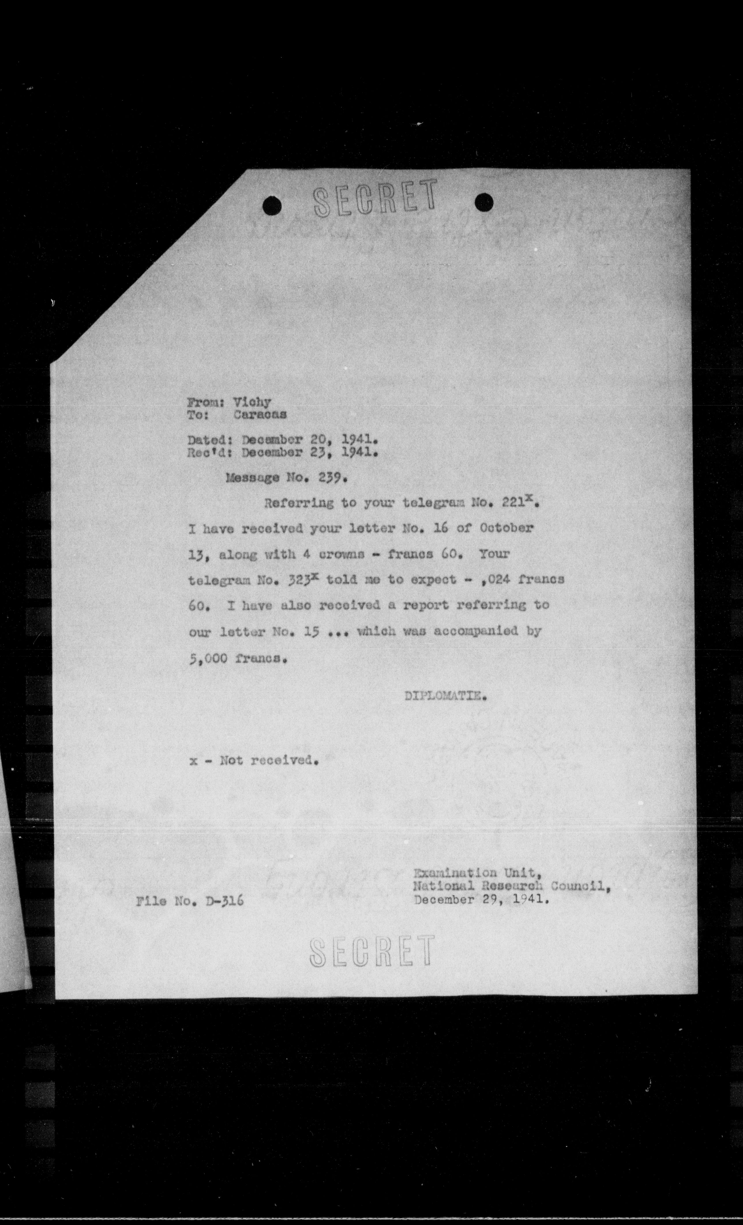 I have received your letter No. 16 of October 13, along with 4 crowns - francs 60. Your telegram No. 323X told me to expect - .024 francs 60. I have also received a report referring to our letter No. 15 ... which was accompanied by 5,000 francs.