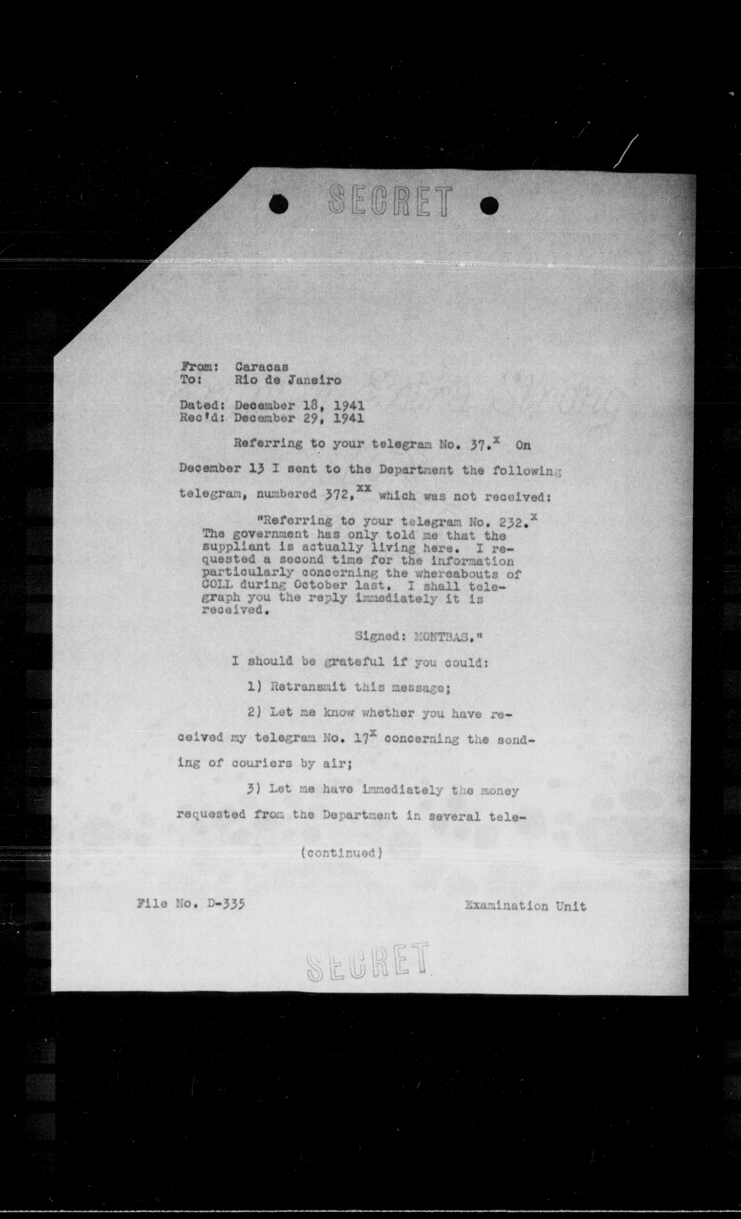 Referring to your telegram No. 37, on December 13 I sent to the Department the following telegram, numbered 372, which was not received: