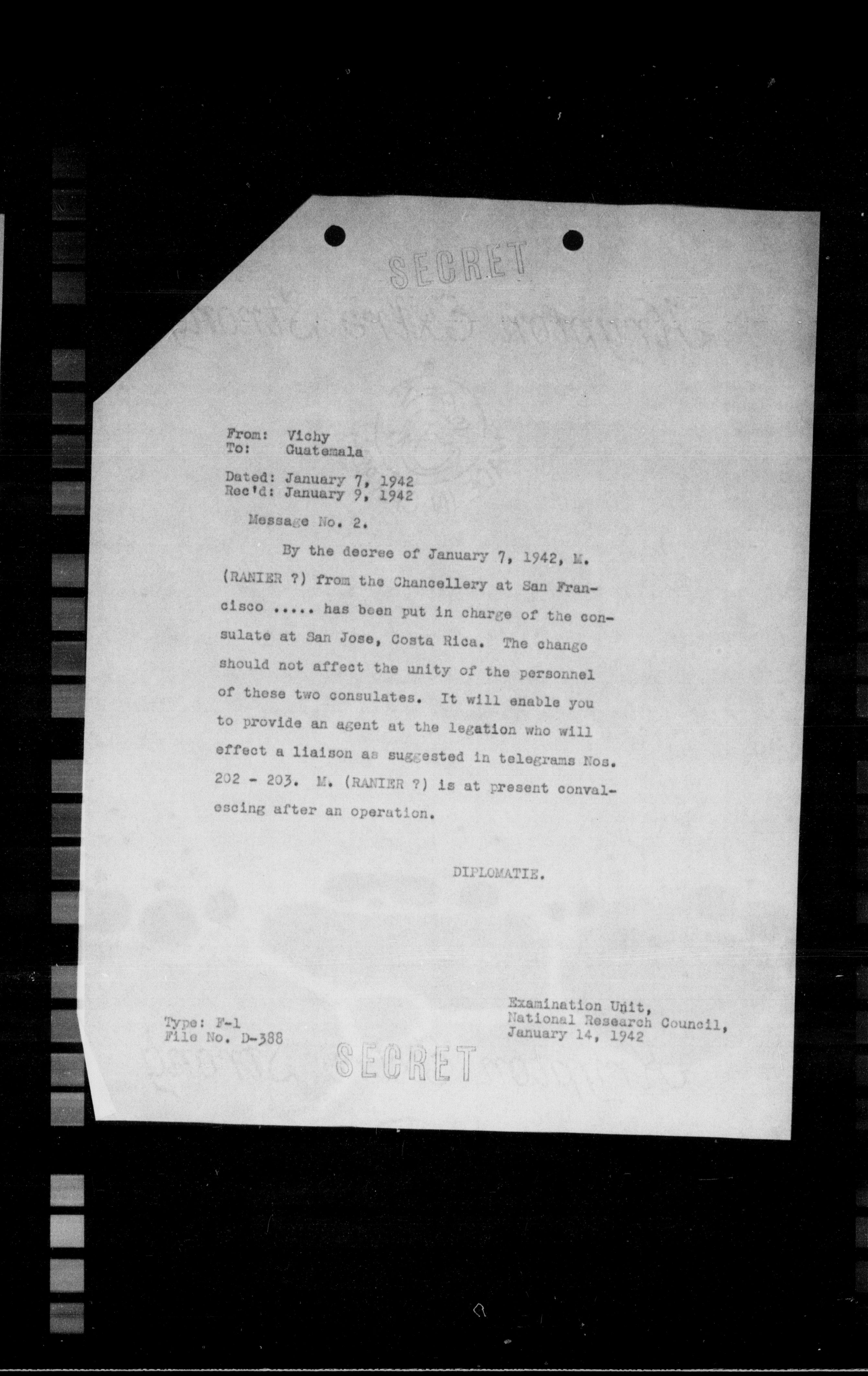By the decree of January 7, 1942, M. (RANIER ?) from the Chancellery at San Francisco ...... has been put in charge of the consulate at San Jose, Costa Rica. The change should not affect the unity of the personnel of these two consulates. It will enable you to provide an agent at the location who will effect a liaison as suggested in telegrams Nos. 202 - 203. M. (RANIER ?) is at present convalescing after an operation.