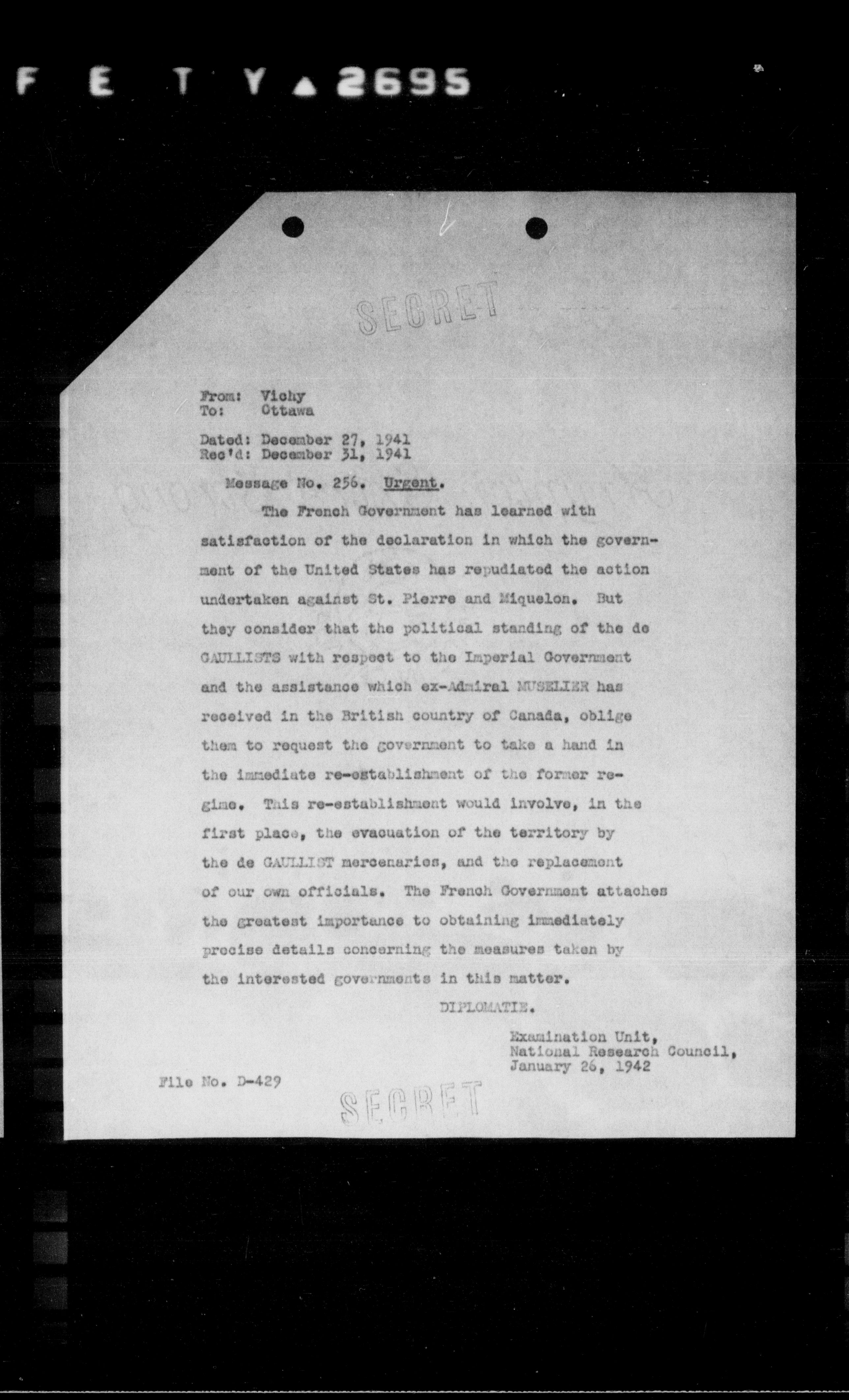 The French Government has learned with satisfaction of the declaration in which the government of the United States has repudiated the action undertaken against St. Pierre and Miquelon. But they consider that the political standing of the de GALLIETS with respect to the Imperial Government and the assistance which ex-Admiral MUSELIER has received in the British country of Canada, oblige them to request the government to take a hand in the immediate re-establishment of the former regime. This re-establishment would involve, in the first place, the evacuation of the territory by the de GALLIET mercenaries, and the replacement of our own officials. The French Government attaches the greatest importance to obtaining immediately precise details concerning the measures taken by the interested governments in this matter.