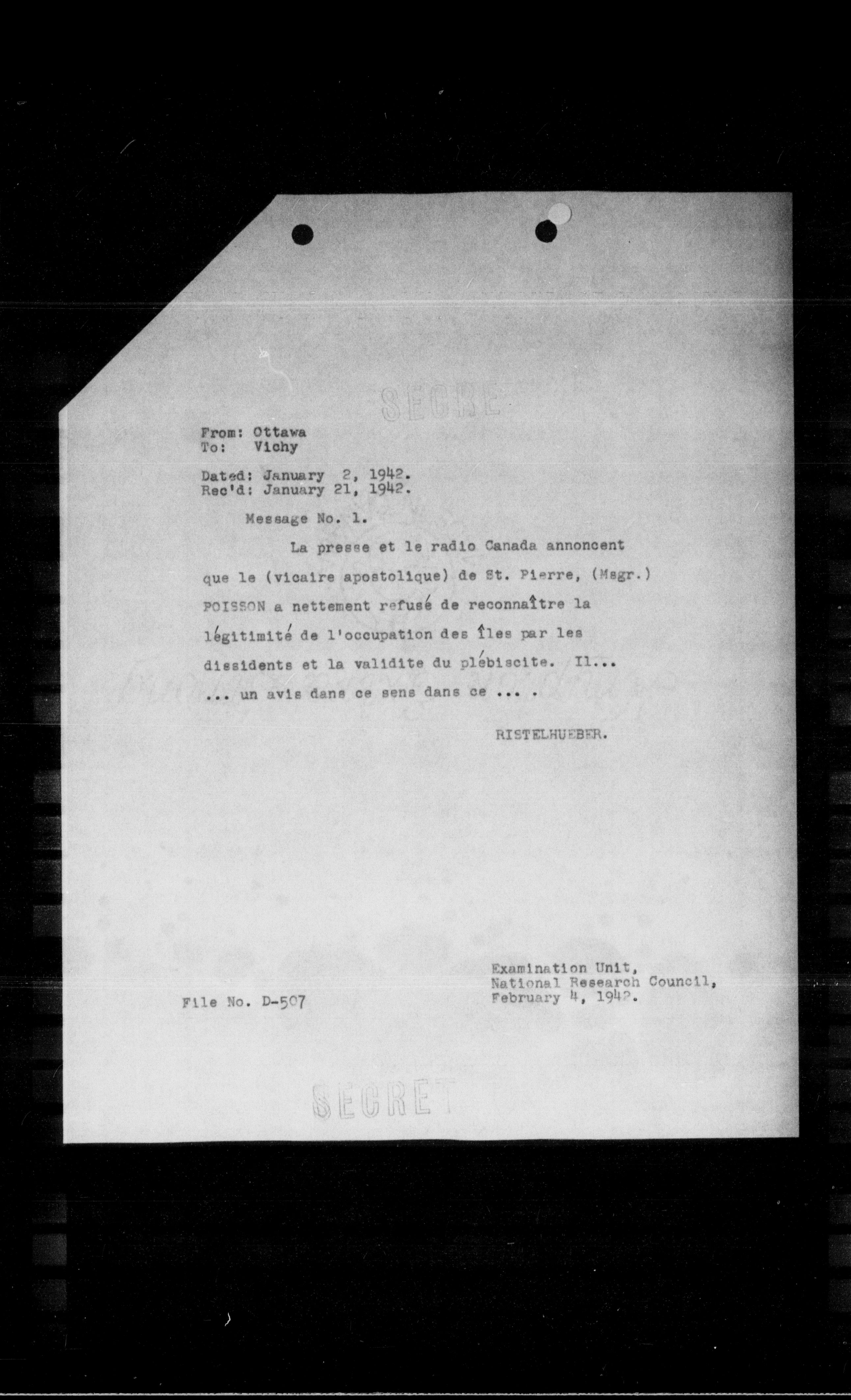 La presse et le radio Canada annoncent que le (vicaire apostolique) de St. Pierre, (Megr.) POISSON a nettement refusé de reconnaitre la légitimité de l'occupation des îles par les dissidents et la validite du plébiscite. Il... ... un avis dans ce sens dans ce ... .