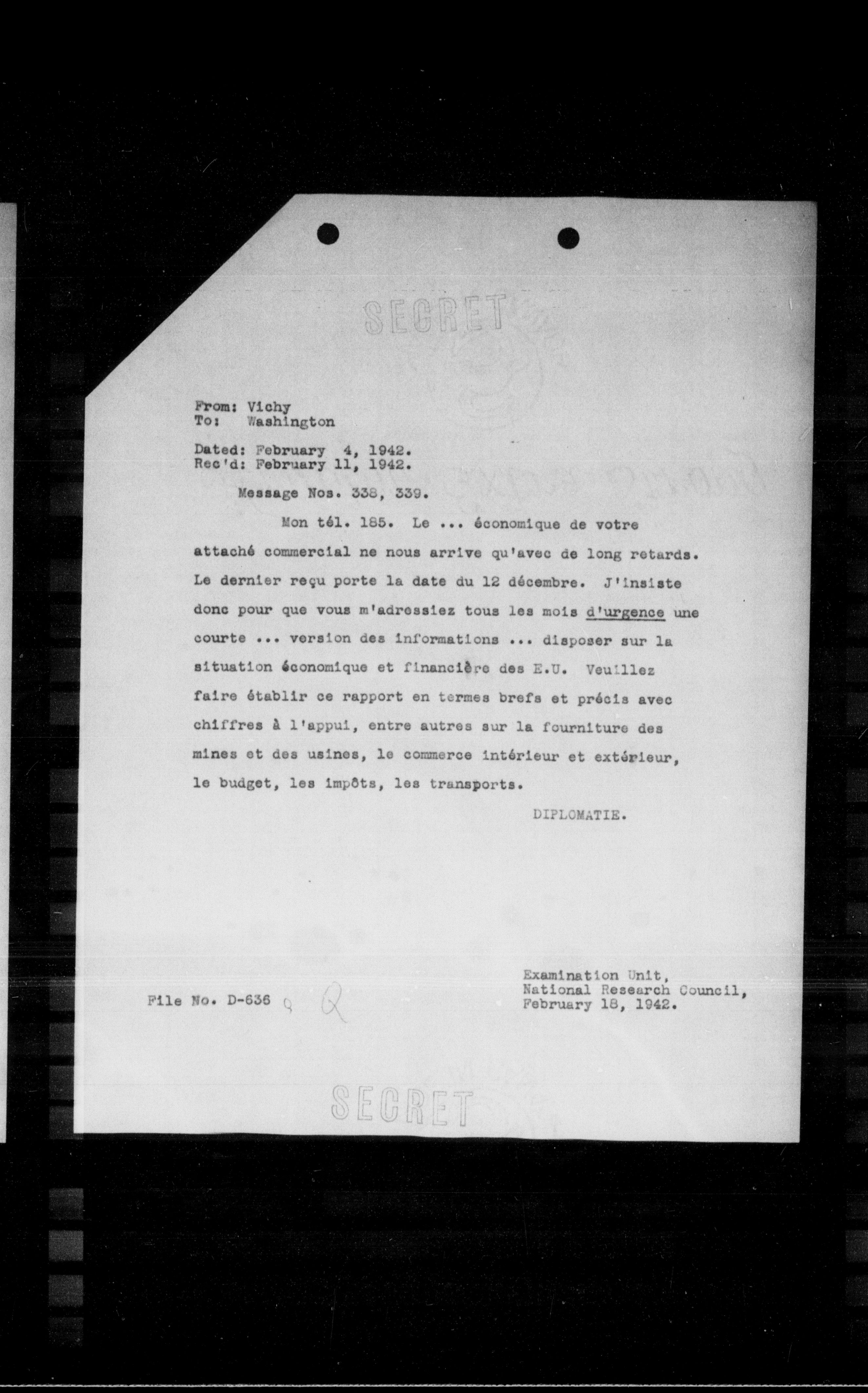 Examination Unit, National Research Council, February 18, 1942.