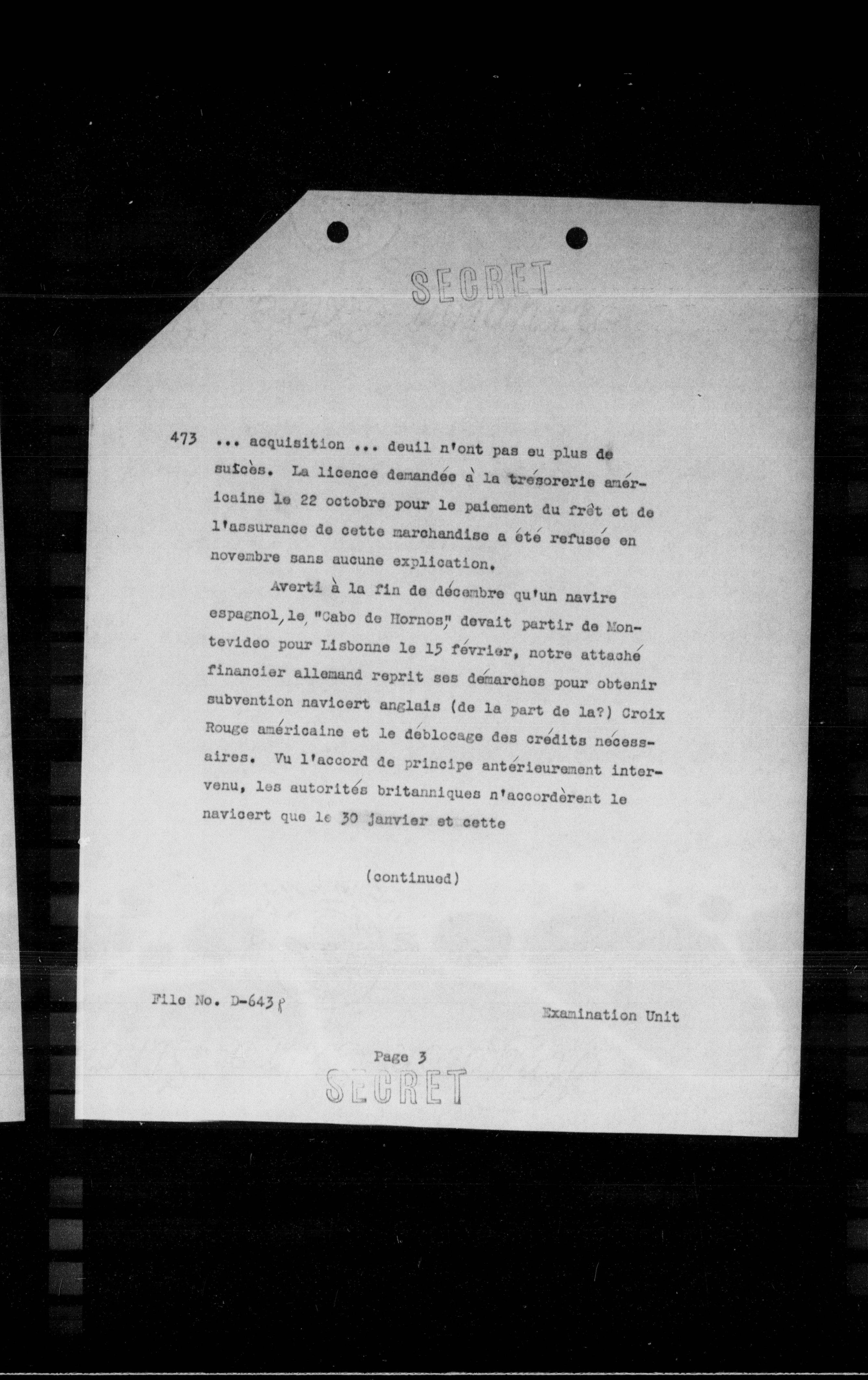 Averti à la fin de décembre qu'un navire espagnol, le "Cabo de Hornos" devait partir de Montevideo pour Lisbonne le 15 février, notre attaché financier allemand reprit ses demarches pour obtenir subvention navicert anglais (de la part de la?) Croix Rouge américaine et le déblocage des crédits nécessaires. Vu l'accord de principe antérieurement intervenu, les autorités britanniques n'accordèrent le navicert que le 30 janvier et cette