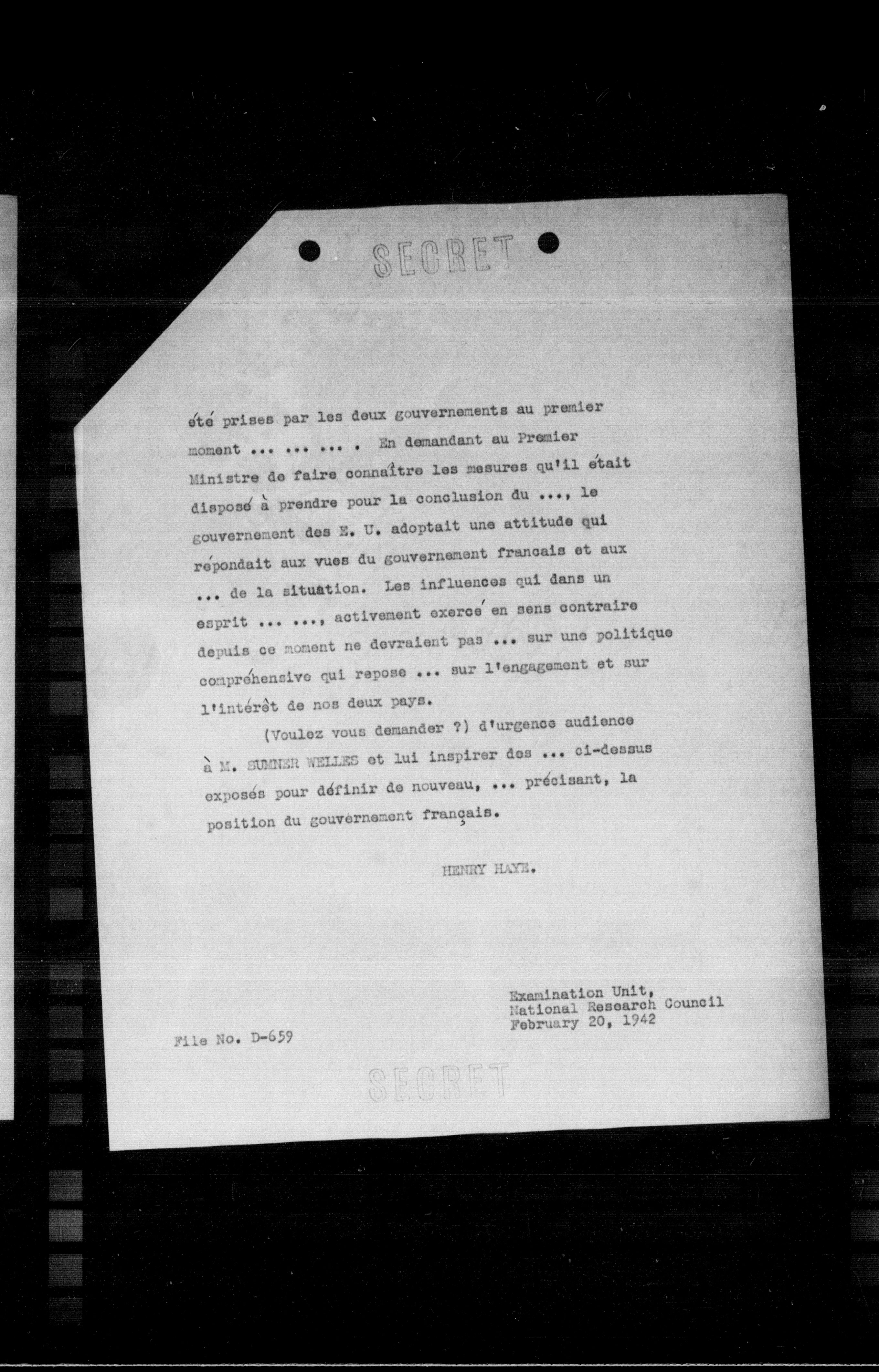 (Voulez vous demander ?) d'urgence audience à M. SUSSEN WELLES et lui inspirer des ... ci-dessus exposés pour définir de nouveau, ... précisant, la position du gouvernement français.