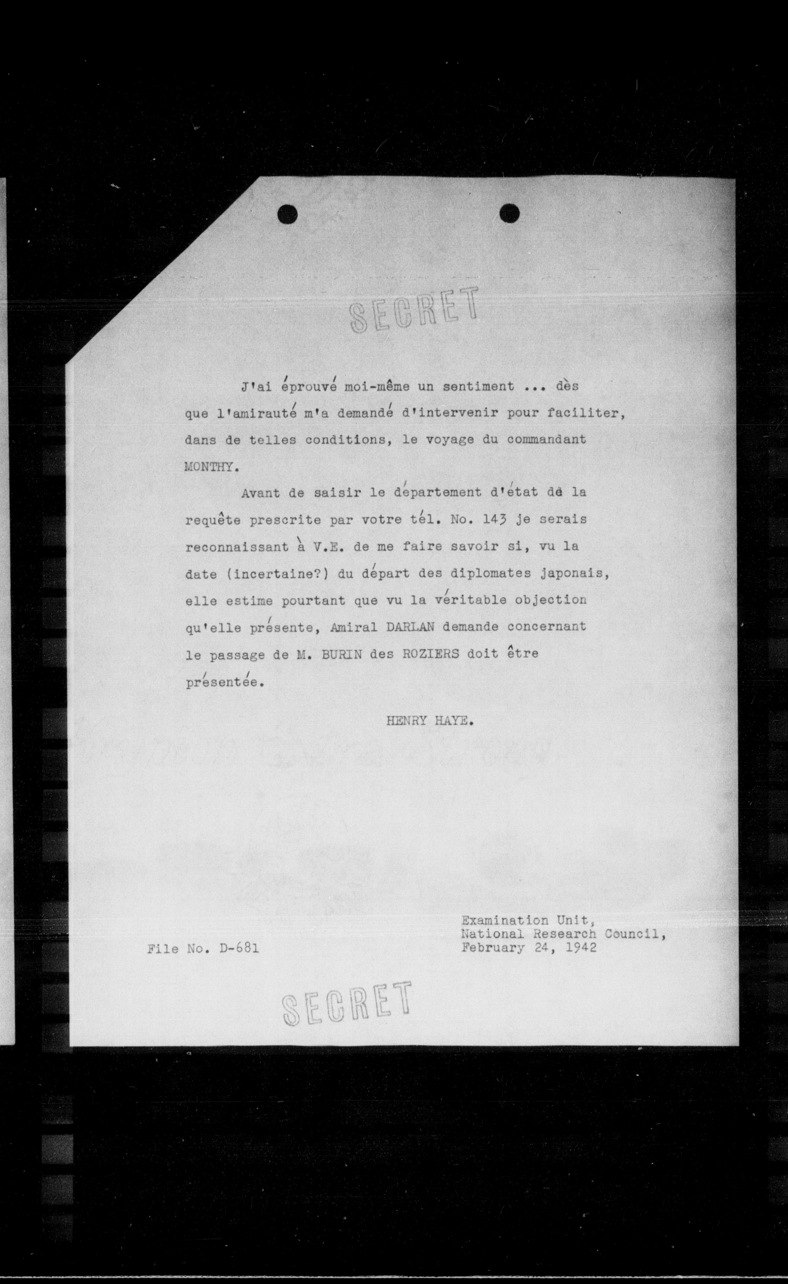 Avant de saisir le département d'état de la requête prescrite par votre tél. No. 143 je serais reconnaissant à V.E. de me faire savoir si, vu la date (incertaine?) du départ des diplomates japonais, elle estime pourtant que vu la véritable objection qu'elle présente, Amiral DARLAN demande concernant le passage de M. BURIN des ROZIERS doit être présentée.
