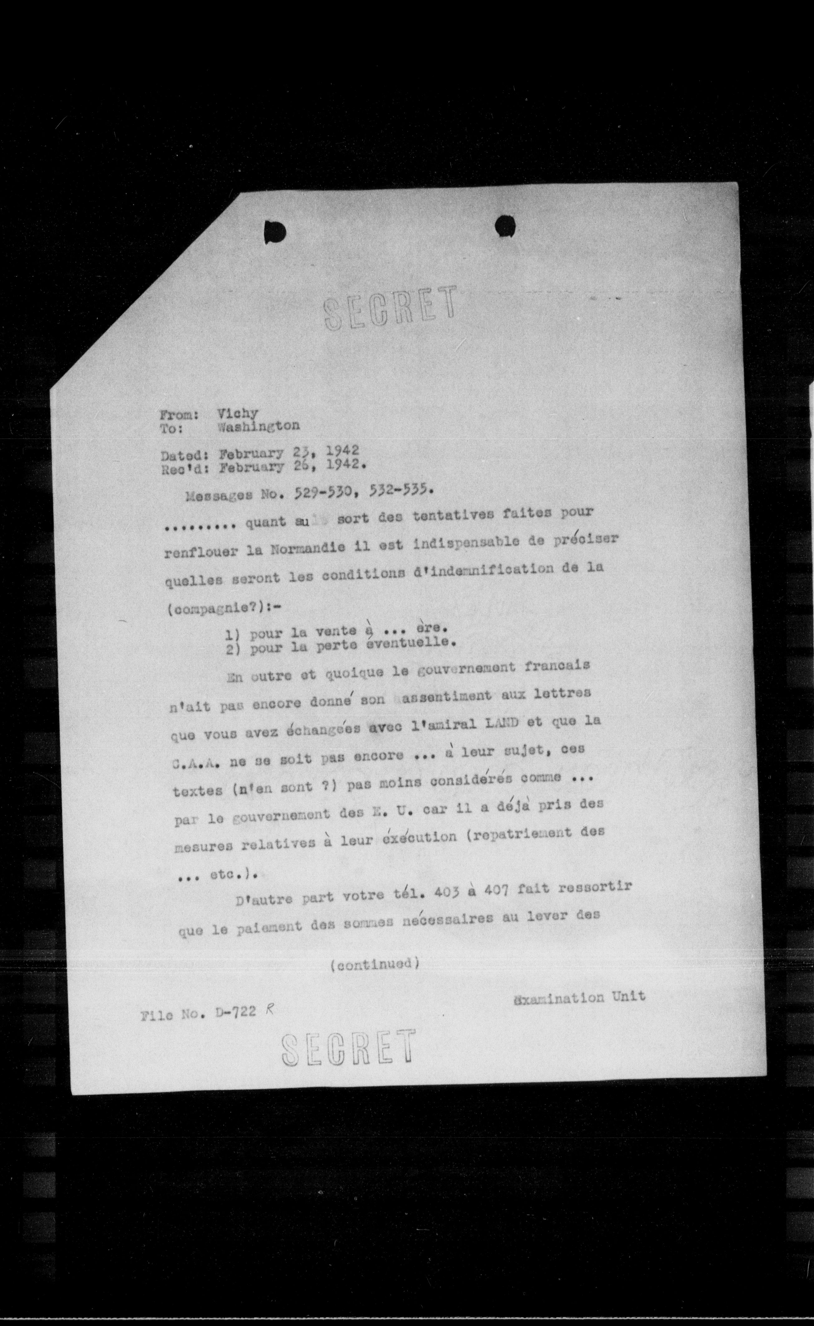 En outre et quoique le gouvernement français n'ait pas encore donné son assentiment aux lettres que vous avez échangées avec l'amiral LAND et que la G.A.A. ne se soit pas encore ... à leur sujet, ces textes (n'en sont ?) pas moins considérés comme ... par le gouvernement des E. U. car il a déjà pris des mesures relatives à leur exécution (repatriement des ... etc.).