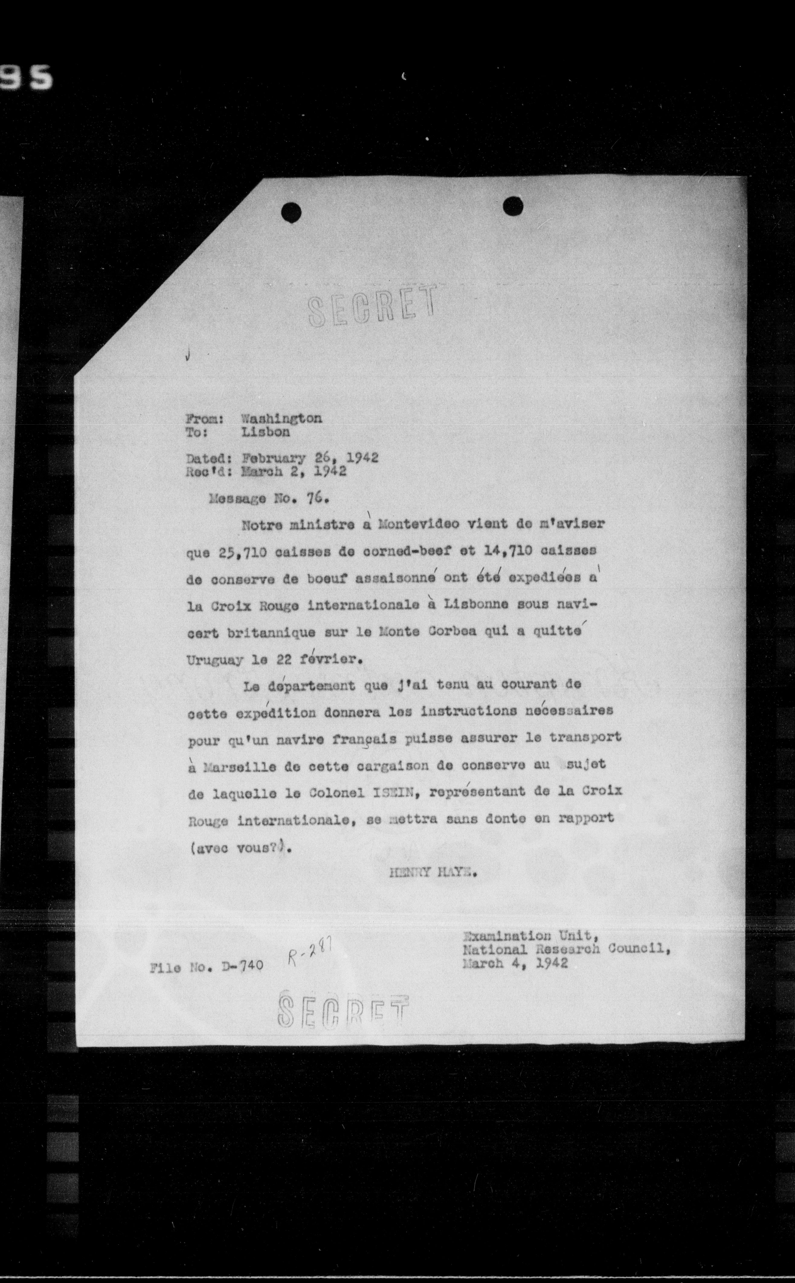 Notre ministre à Montevideo vient de m'aviser que 25,710 caisses de corned-beef et 14,710 caisses de conserve de bœuf assaisonné ont été expédiées à la Croix Rouge internationale à Lisbonne sous navicart britannique sur le Monte Corbea qui a quitté Uruguay le 22 février.