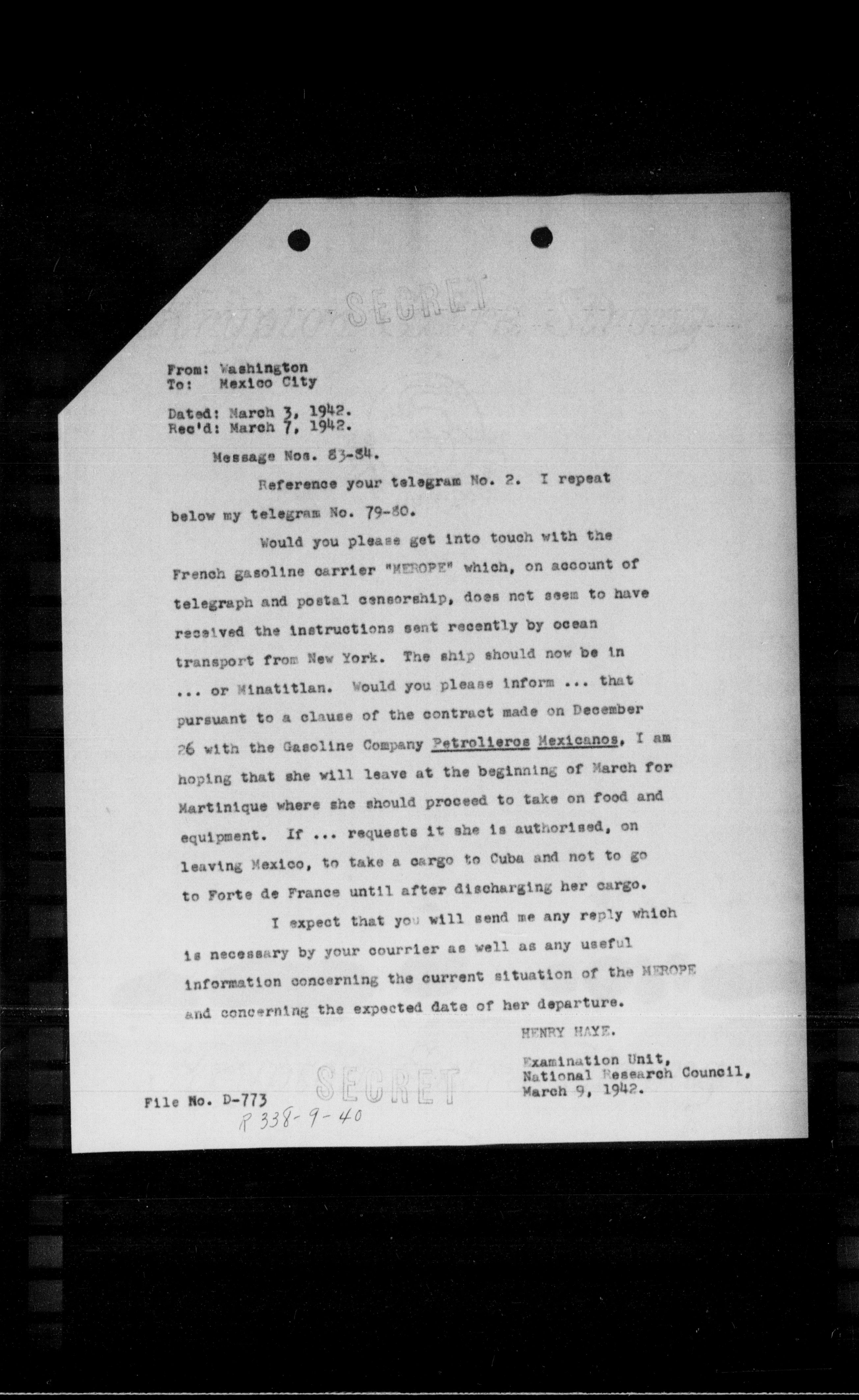 Would you please get into touch with the French gasoline carrier "MEMOPE" which, on account of telegraph and postal censorship, does not seem to have received the instructions sent recently by ocean transport from New York. The ship should now be in ... or Minatitlan. Would you please inform ... that pursuant to a clause of the contract made on December 26 with the Gasoline Company Petrolieros Mexicanos, I am hoping that she will leave at the beginning of March for Martinique where she should proceed to take on food and equipment. If ... requests it she is authorised, on leaving Mexico, to take a cargo to Cuba and not to go to Forte de France until after discharging her cargo.