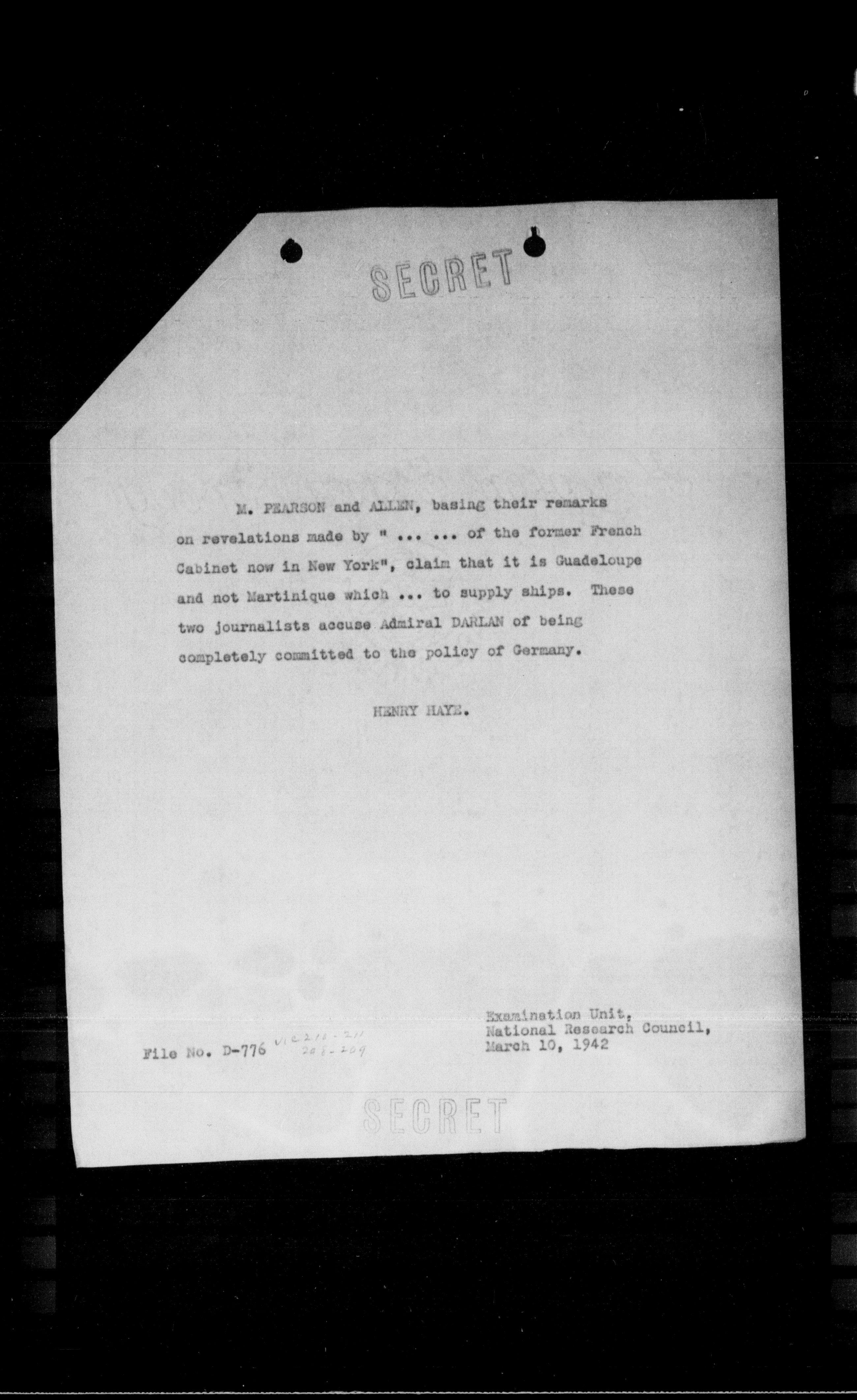 M. PEARSON and ALLEN, basing their remarks on revelations made by "... ... of the former French Cabinet now in New York", claim that it is Guadeloupe and not Martinique which ... to supply ships. These two journalists accuse Admiral DARLAN of being completely committed to the policy of Germany.