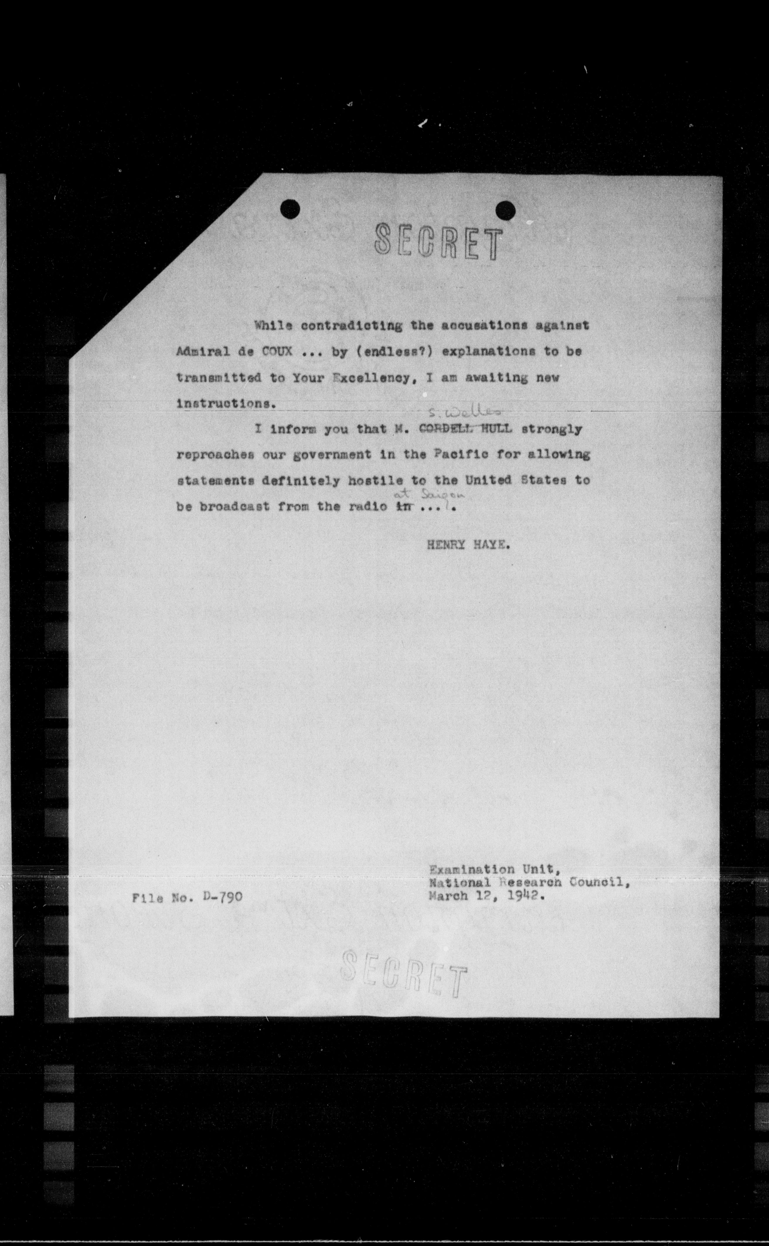 I inform you that M. CORDELL HULL strongly reproaches our government in the Pacific for allowing statements definitely hostile to the United States to be broadcast from the radio in ....