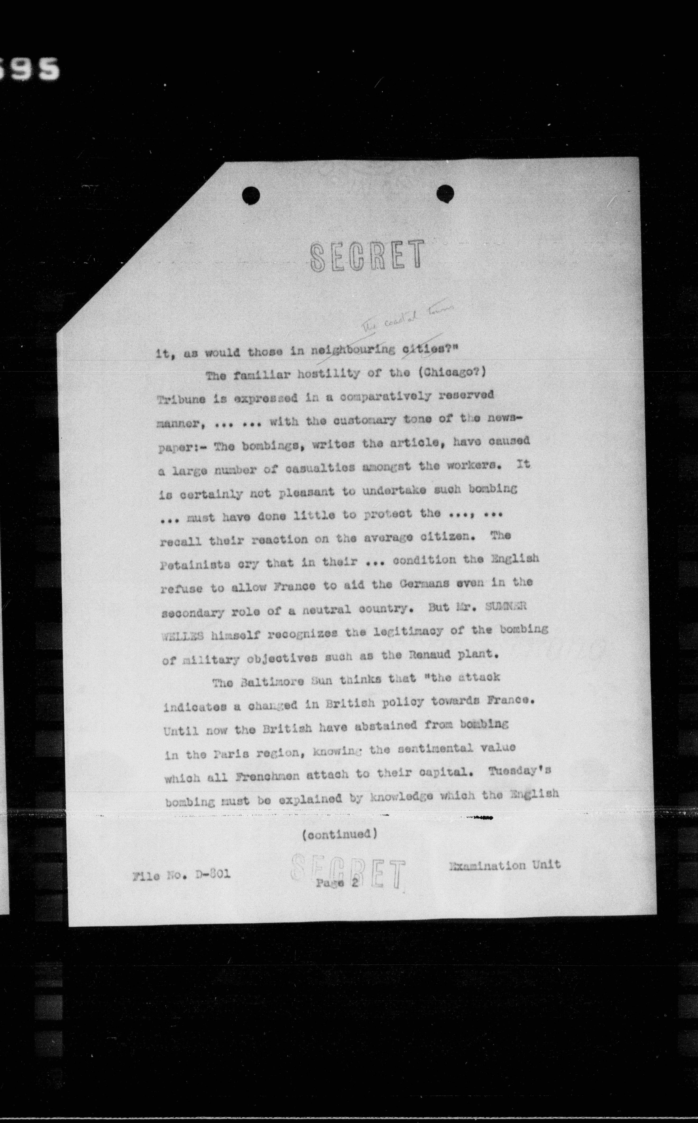 The familiar hostility of the (Chicago?) Tribune is expressed in a comparatively reserved manner, ... with the customary tone of the newspaper: The bombings, writes the article, have caused a large number of casualties amongst the workers. It is certainly not pleasant to undertake such bombing ... must have done little to protect the ... recall their reaction on the average citizen. The Petainists cry that in their ... condition the English refuse to allow France to aid the Germans even in the secondary role of a neutral country. But Mr. SURGER WELLES himself recognizes the legitimacy of the bombing of military objectives such as the Renaud plant.