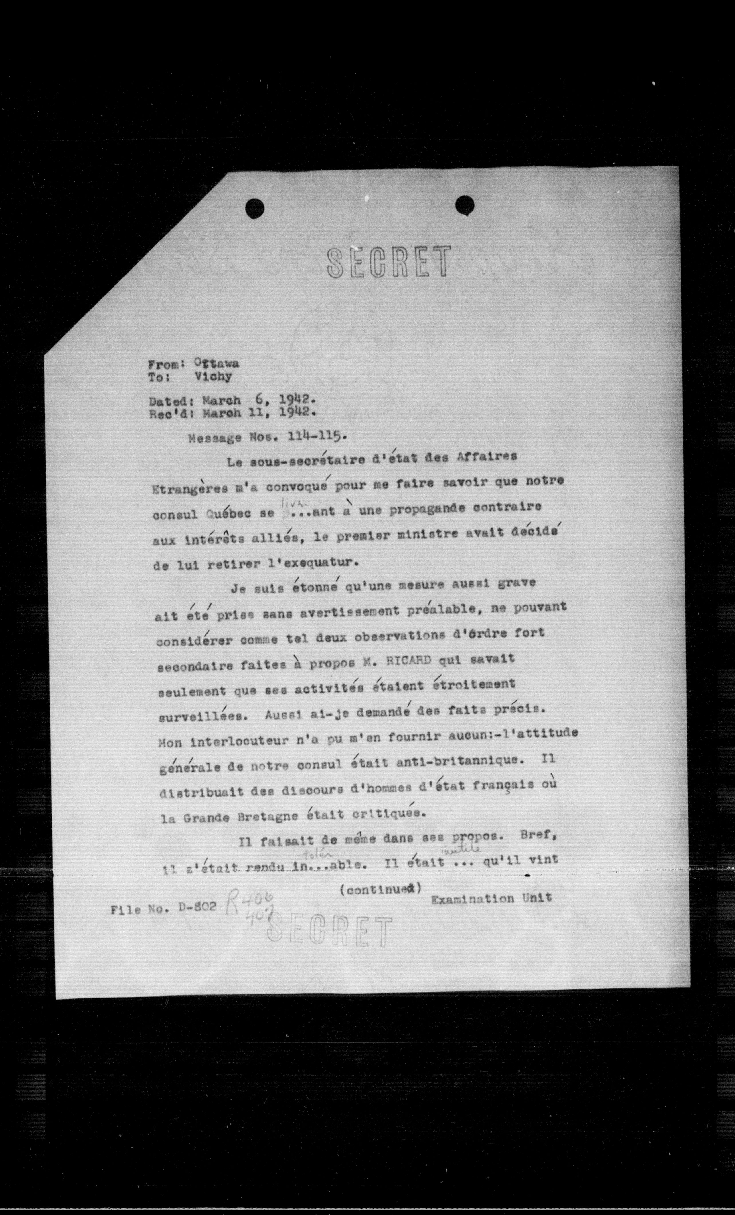 Le sous-secrétaire d'état des Affaires étrangères m'a convoqué pour me faire savoir que notre consul Québec se ...ant à une propagande contraire aux intérêts alliés, le premier ministre avait décidé de lui retirer l'exequatur.