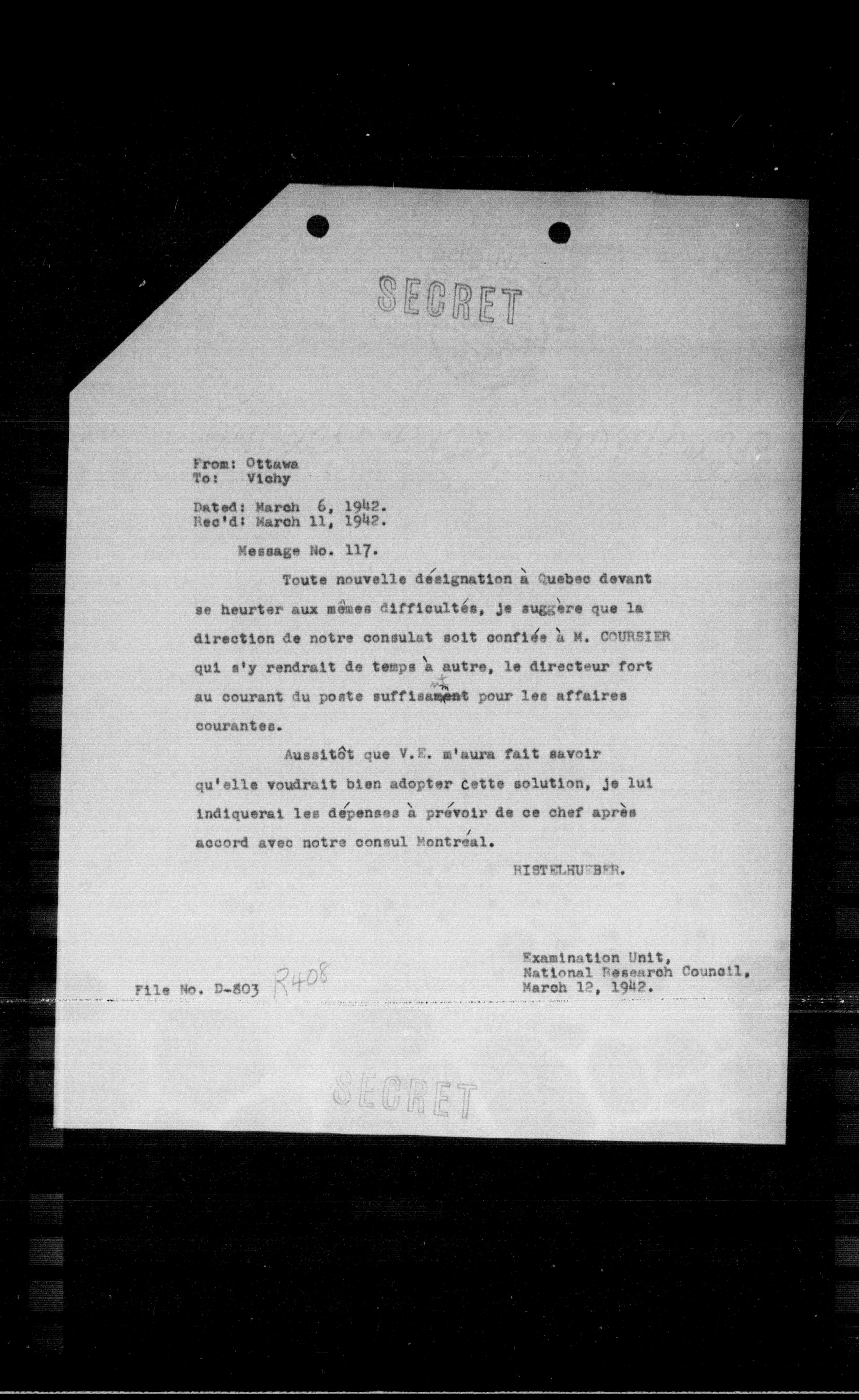 Toute nouvelle désignation à Quebec devant se heurter aux mêmes difficultés, je suggère que la direction de notre consulat soit confiée à M. COURSIER qui s'y rendrait de temps à autre, le directeur fort au courant du poste suffisant pour les affaires courantes.