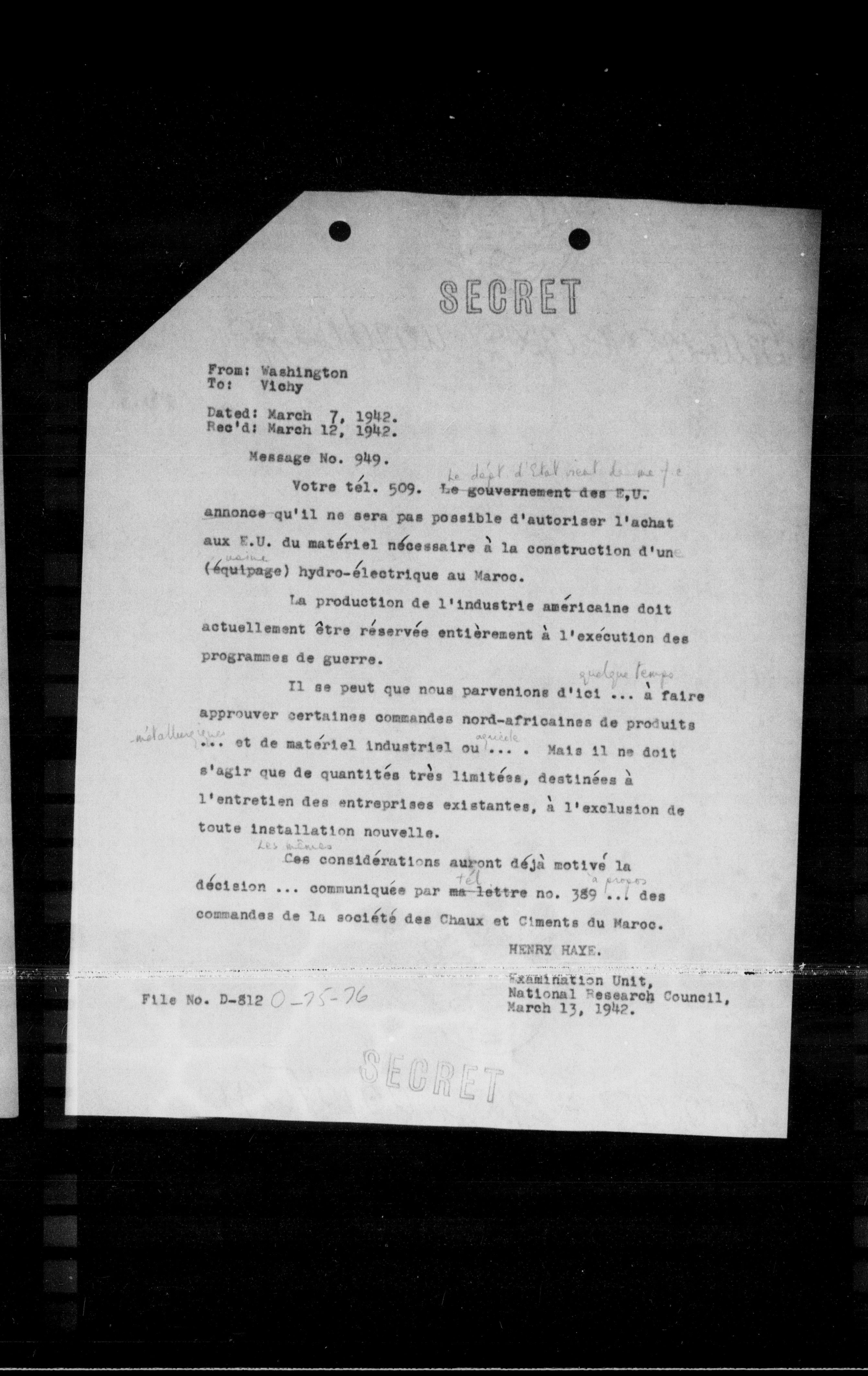 annonce qu'il ne sera pas possible d'autoriser l'achat aux E.U. du matériel nécessaire à la construction d'un (équipage) hydro-électrique au Maroc.