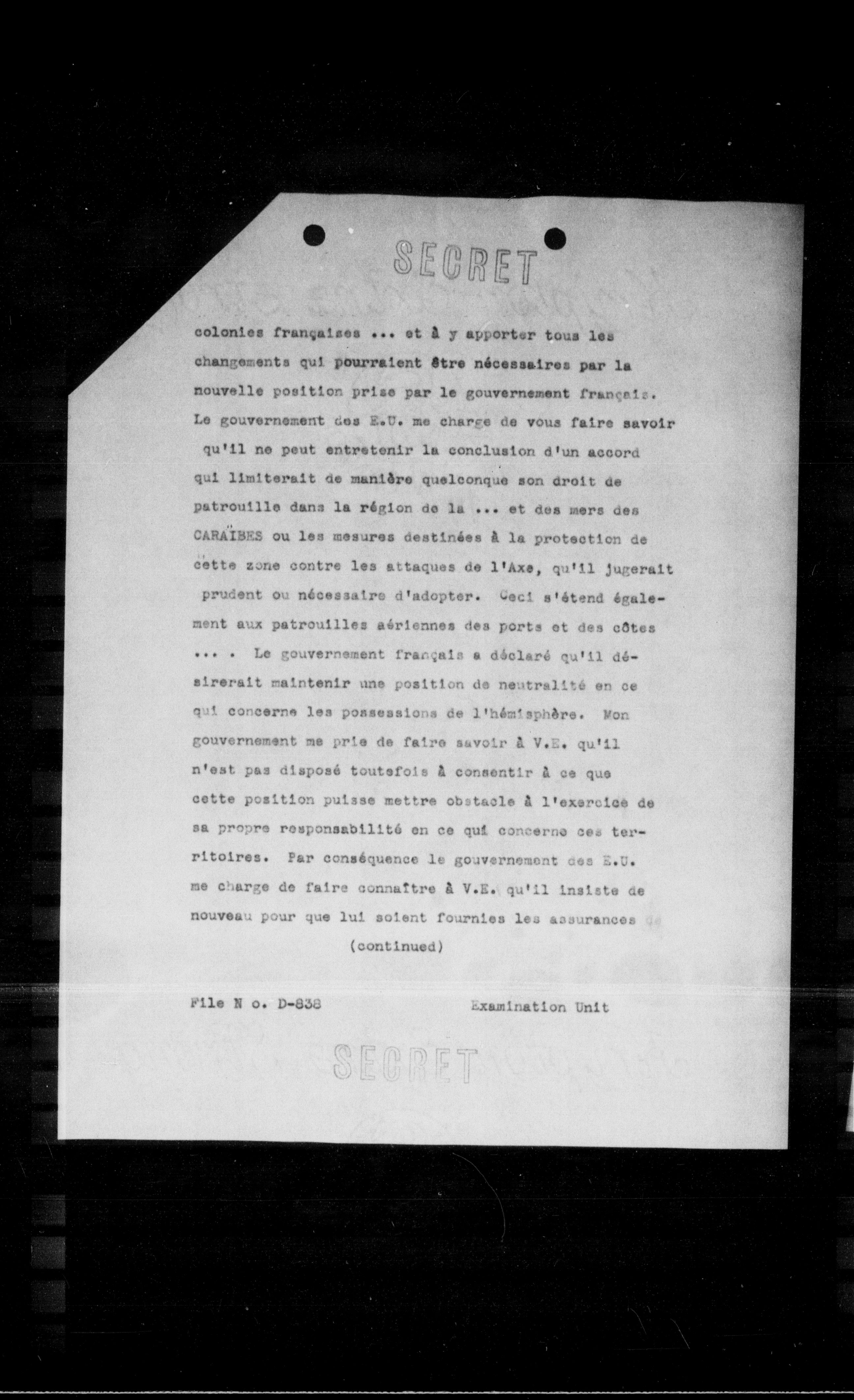 colonies françaises ... et a y apporter tous les changements qui pourraient etre nécessaires par la nouvelle position prise par le gouvernement frange12. Le gouvernement des E.U. me charge de vous faire savoir qu'il ne peut entretenir la conclusion d'un accord qui limiterait de manière quelconque son droit de patrouille dans la région de la ... et des mers des CARAIBES ou les mesures destinées a la protection de cette zone contre les attaques de l'Axe, qu'il jugera1t prudent ou nécessaire d'adopter. Weci s'étend également aux patrouilles aériennes des ports et des côtes ... . Le gouvernement français a déclaré qu'il désirerait maintenir une position de neutralite en ce qui concerne les possessions de l'hémisphère. Non gouvernement me prie de faire savoir a V.E. qu'il n'est pas disposé toutefois a consentir a ce que cette position puisse mettre obstacle a l'exercide de sa propre responsabilité en ce qui concerne ces territoires. Par conséquence le gouvernement des E.U. me charge de faire connaitre a V.E. qu'il insiste de nouveau pour que lui soient fournies les assurances (continued)
