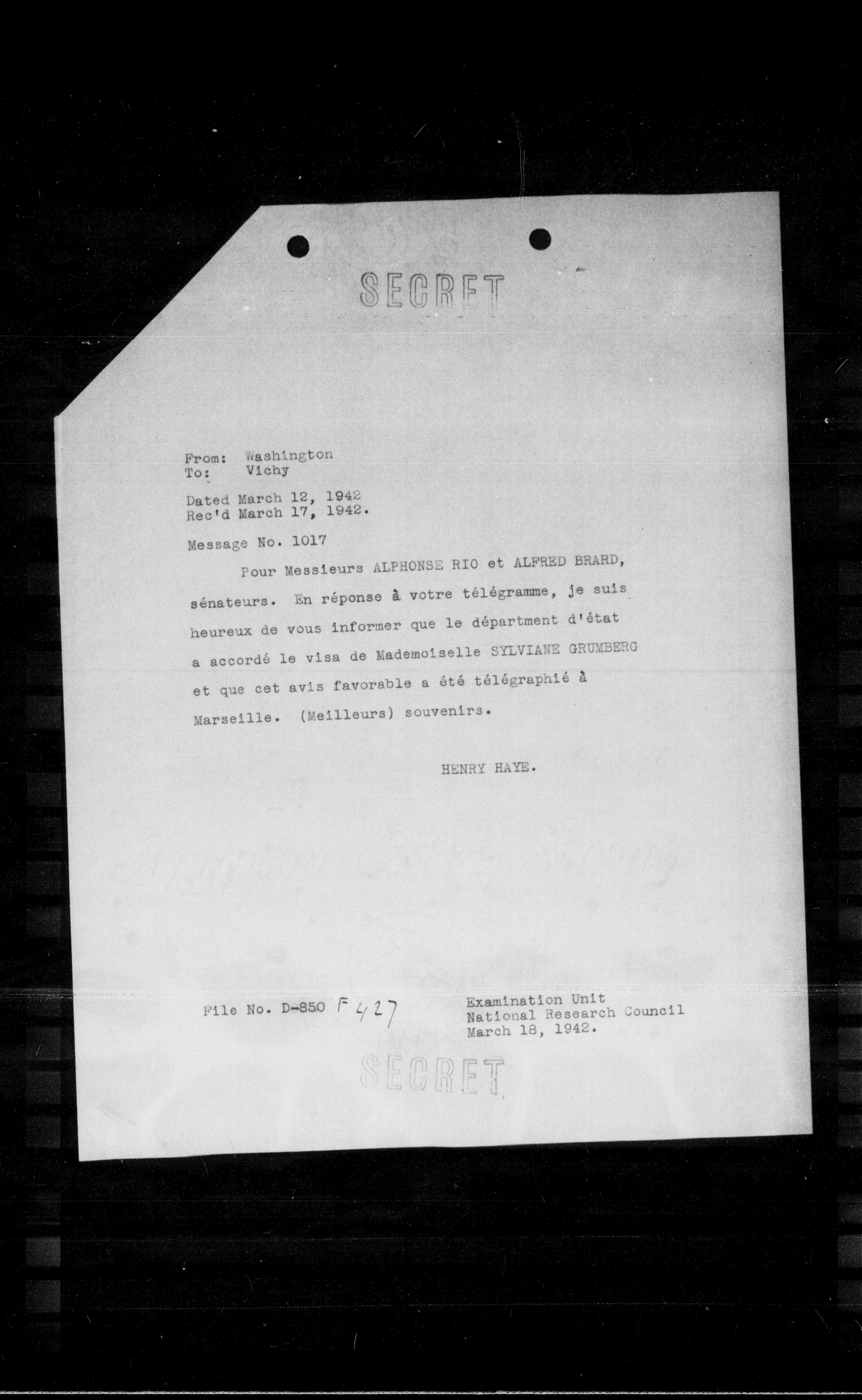 Pour Messieurs ALPHONSE RIO et ALPRED BRARD, sénateurs. En réponse à votre télégramme, je suis heureux de vous informer que le départment d'état a accordé le visa de Mademoiselle SYLVIANE GRUMBERG et que cet avis favorable a été télégraphié à Marseille. (Meilleurs) souvenirs.