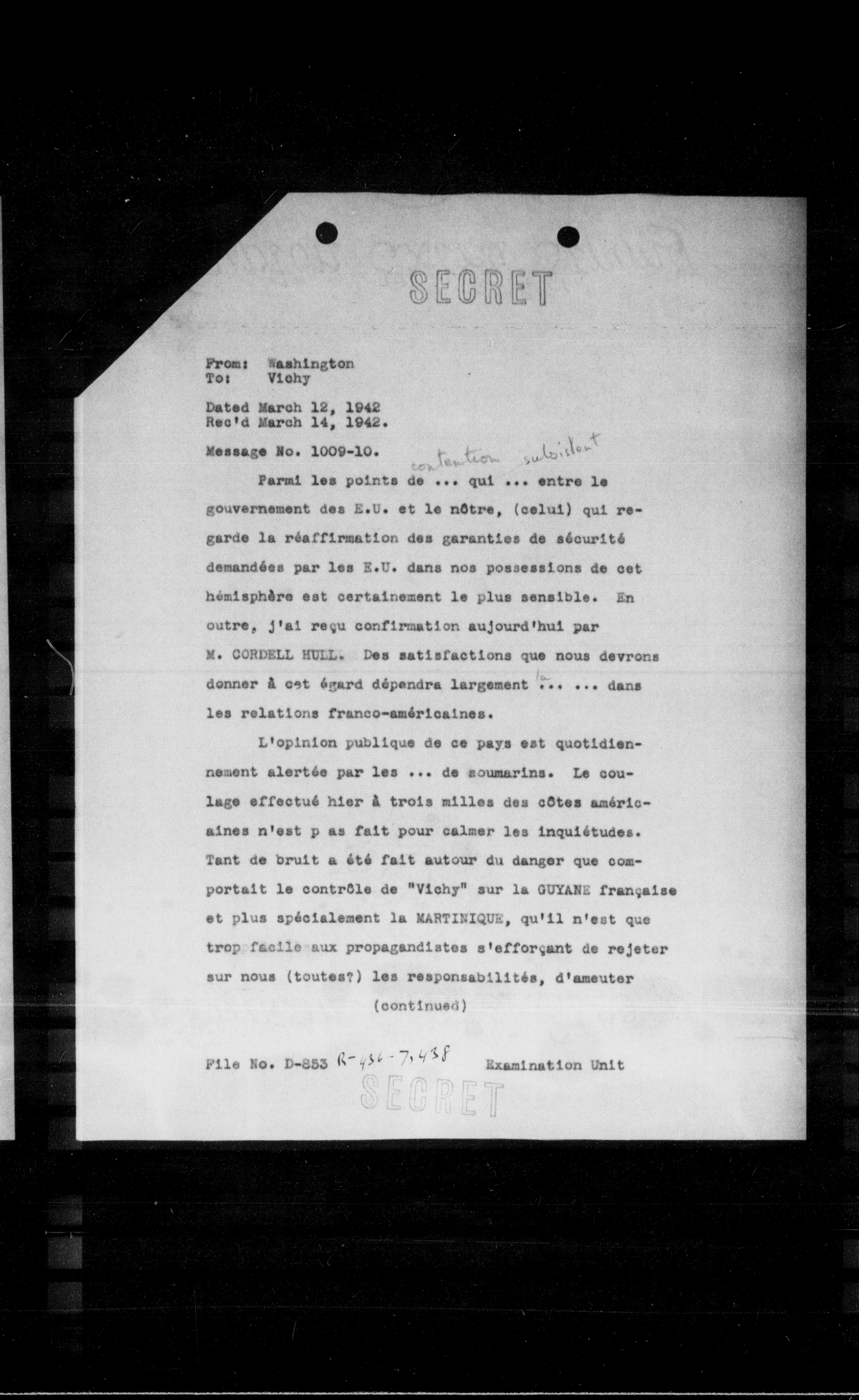 L'opinion publique de ce pays est quotidiennement alertée par les ... de soumants. Le coulage effectué hier à trois milles des côtes américaines n'est pas fait pour calmer les inquiétudes. Tant de bruit a été fait autour du danger que comportait le contrôle de "Vichy" sur la GUYANE française et plus spécialement la MARTINIQUE, qu'il n'est que trop facile aux propagandistes s'efforçant de rejeter sur nous (toutes?) les responsabilités, d'ameuter (continued)