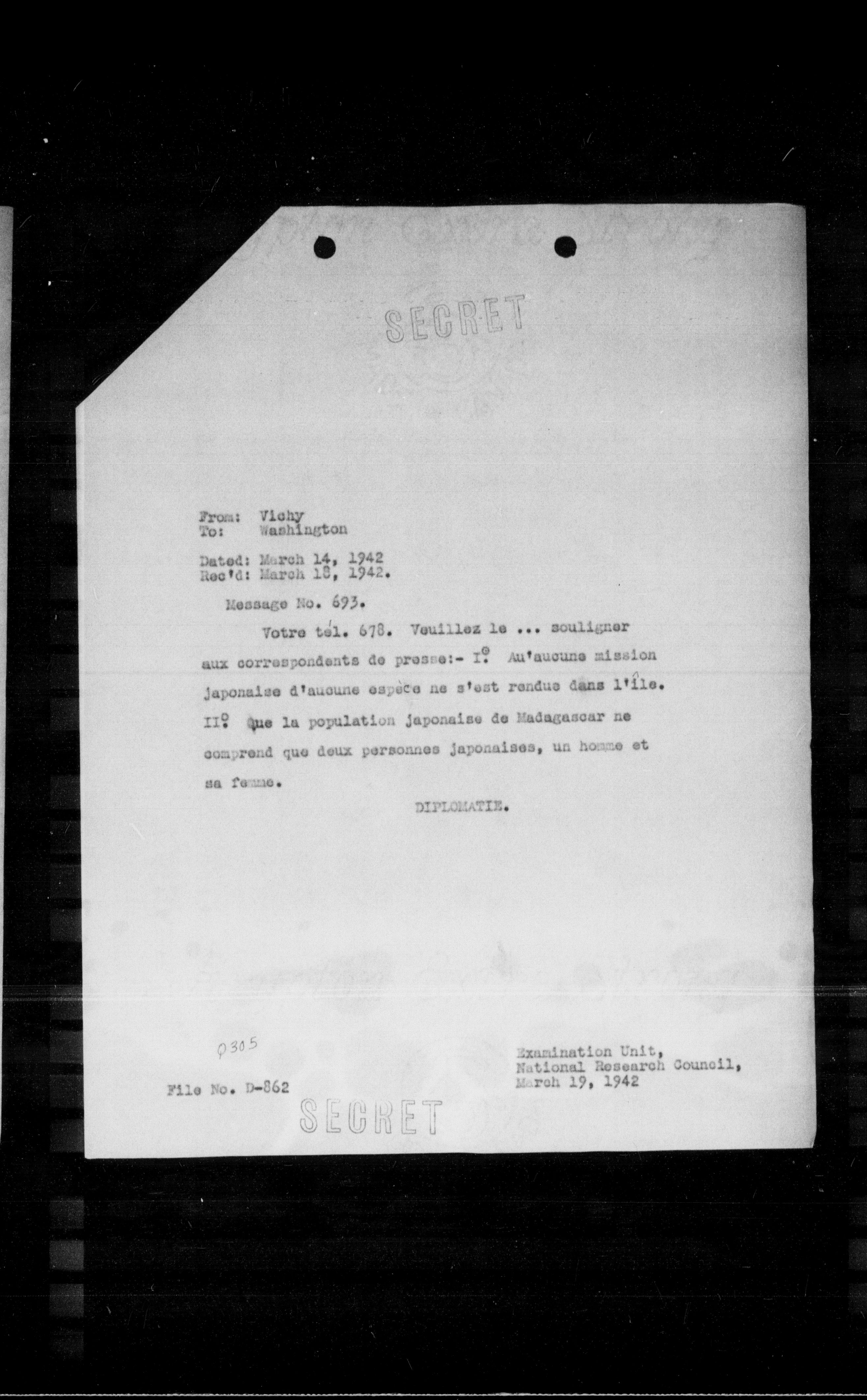 Votre tél. 678. Veuillez le ... souligner aux correspondents de presse:- I. Au'aucune mission japonaise d'aucune espèce ne s'est rendue dans l'île. II. Que la population japonaise de Madagascar ne comprend que deux personnes japonaises, un homme et sa femme.