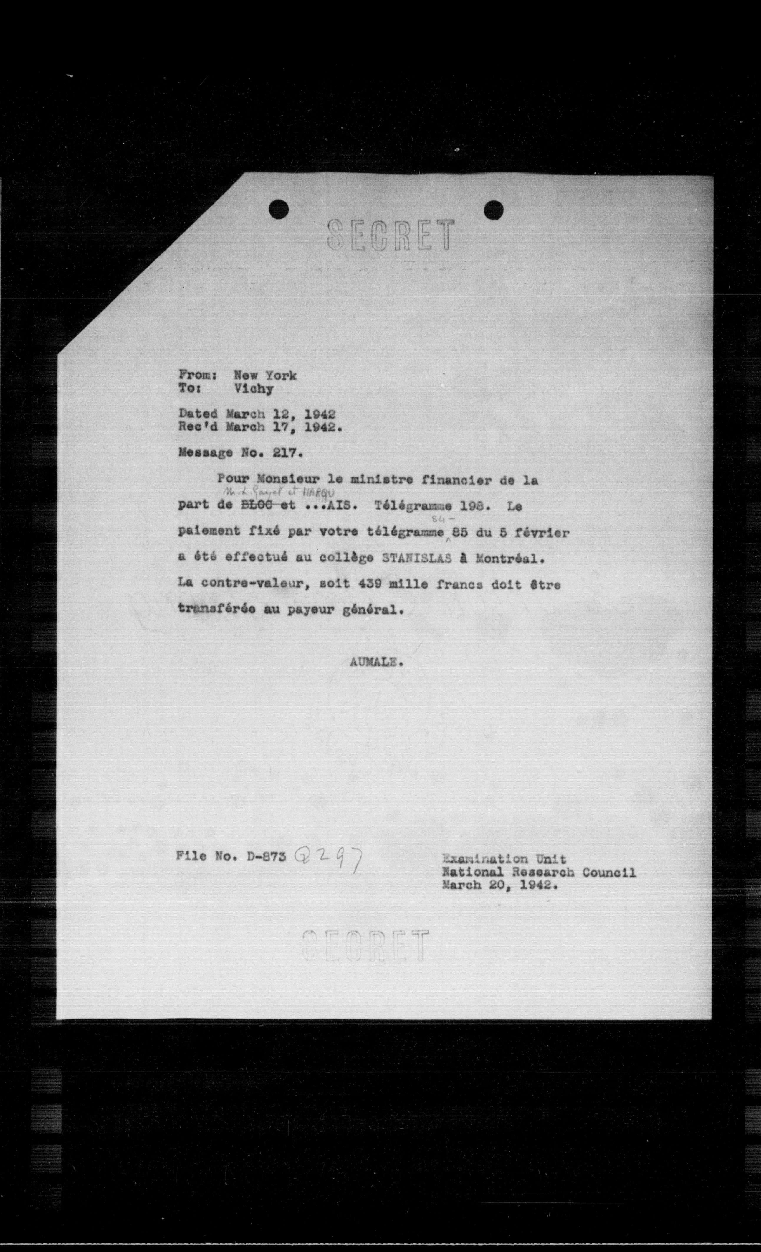 Pour Monsieur le ministre financier de la part de BLOO et ...AIS. Télégramme 198. Le paiement fixé par votre télégramme 85 du 5 février a été effectué au collège STANISLAS & Montréal. La contre-valeur, soit 450 mille francs doit être transférée au payeur général.