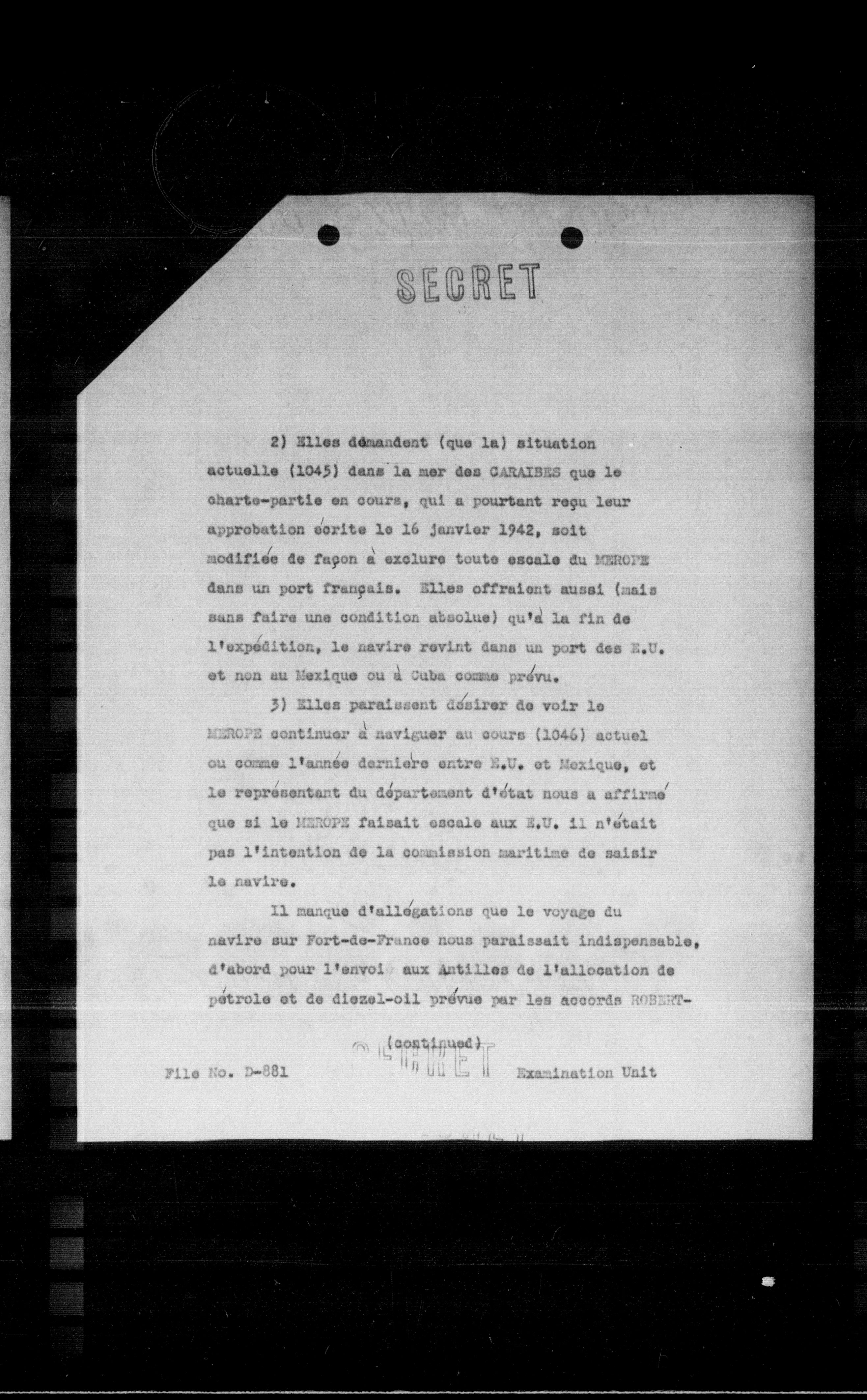 3) Elles paraissent désirer de voir le MEROPE continuer à naviguer au cours (1046) actuel ou comme l'année dernière entre E.U. et Mexique, et le représentant du département d'état nous a affirmé que si le MEROPE faisait escale aux E.U. il n'était pas l'intention de la commission maritime de saisir le navire.