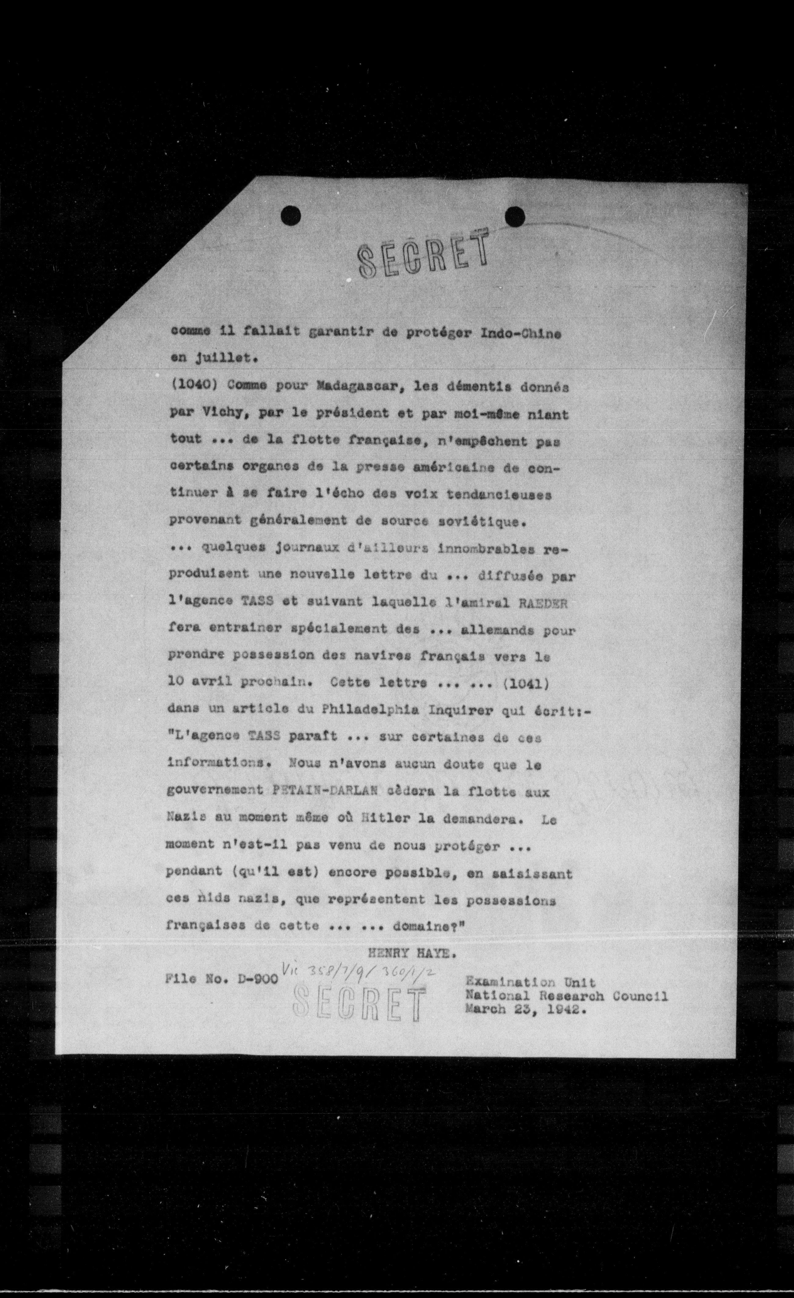 (1040) Comme pour Madagascar, les démentis donnés par Vichy, par le président et par moi-même niant tout ... de la flotte française, n'empêchent pas certains organes de la presse américaine de continuer à se faire l'écho des voix tendancieuses provenant généralement de source soviétique. ... quelques journaux d'ailleurs innombrables reproduisent une nouvelle lettre du ... diffusée par l'agence TASS et suivant laquelle l'amiral RAEDER fera entraîner spécialement des ... allemands pour prendre possession des navires français vers le 10 avril prochain. Cette lettre ... ... (1041) dans un article du Philadelphie Inquirer qui écrit: "L'agence TASS paraît ... sur certaines de ces informations. Nous n'avons aucun doute que le gouvernement PETAIN-DARLAN obdera la flotte aux Nazis au moment même où Hitler la demandera. Le moment n'est-il pas venu de nous protéger ... pendant (qu'il est) encore possible, en saisissant ces nids nazis, que représentent les possessions françaises de cette ... ... domaine?"