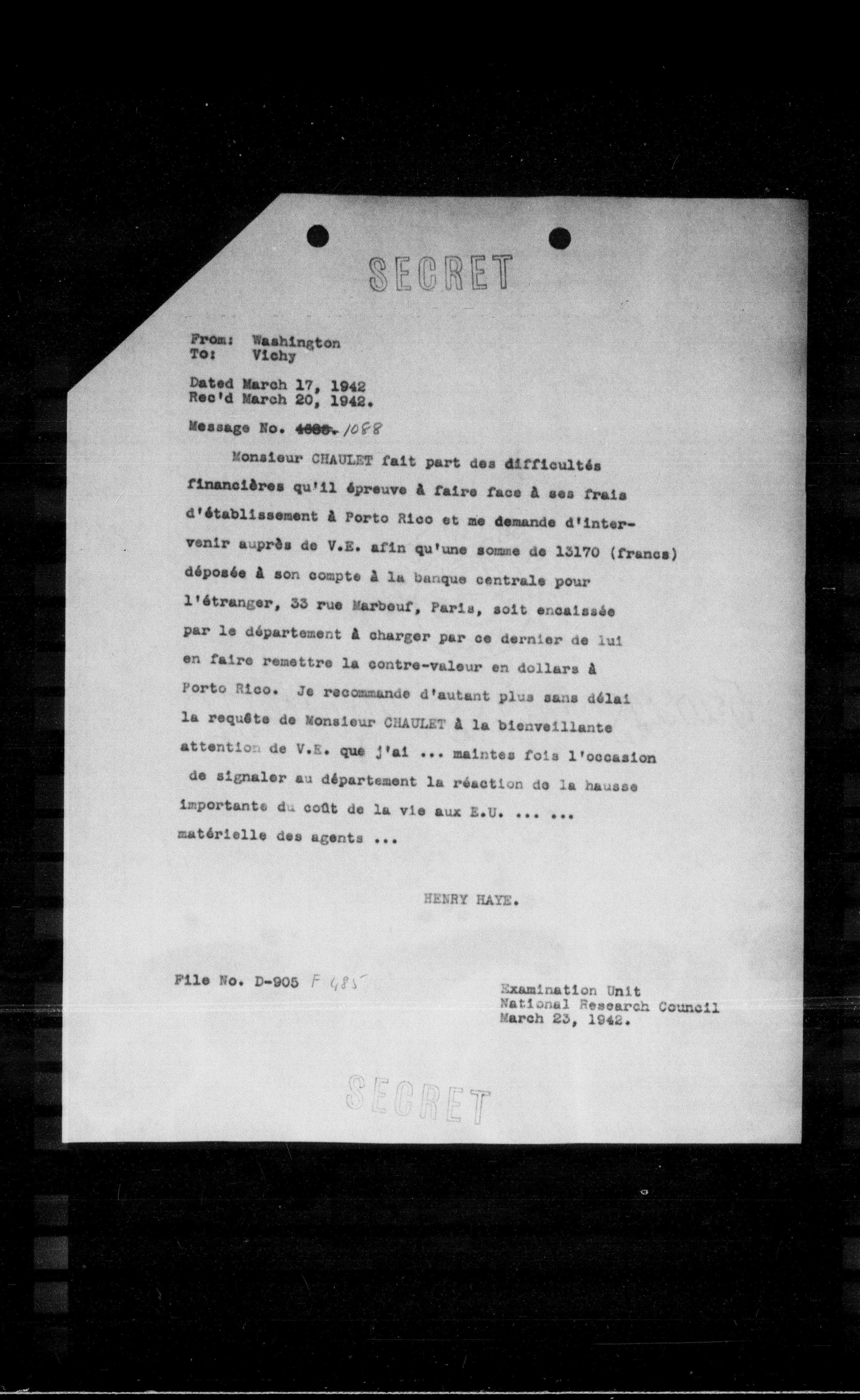 Monsieur CHAULET fait part des difficultés financières qu'il épreuve à faire face à ses frais d'établissement à Porto Rico et me demande d'intervenir auprès de V.E. afin qu'une somme de 13170 (francs) déposée à son compte à la banque centrale pour l'étranger, 35 rue Marbeuf, Paris, soit encaissée par le département à charger par ce dernier de lui en faire remettre la contre-valeur en dollars à Porto Rico. Je recommande d'autant plus sans délai la requête de Monsieur CHAULET à la bienveillante attention de V.E. que j'ai ... maintes fois l'occasion de signaler au département la réaction de la hausse importante du coût de la vie aux E.U. ... matérielle des agents ...