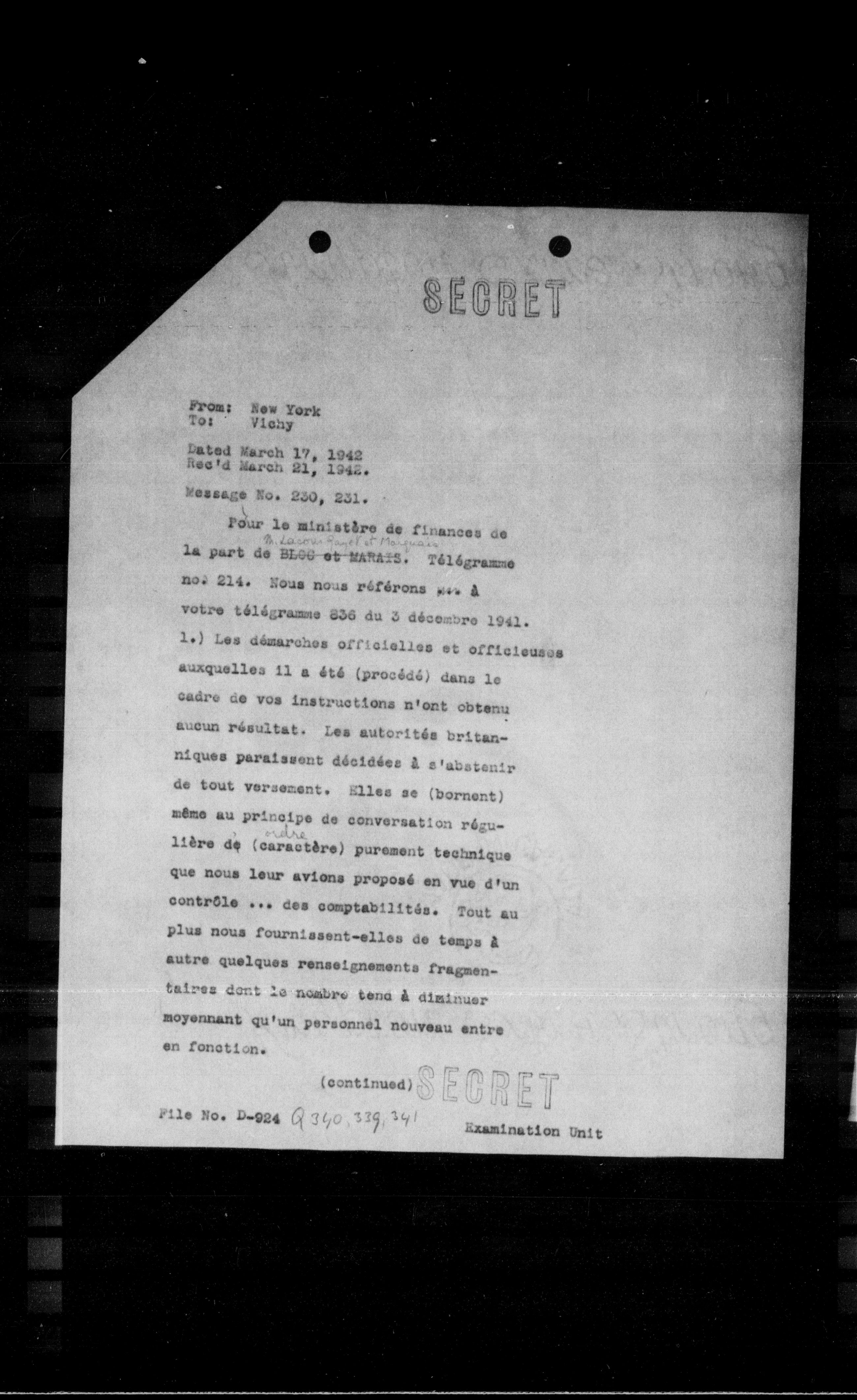 Pour le ministère de finances de la part de BLOO et MANAIS. Télégramme nos 214. Nous nous référons ***** à votre télégramme 236 du 3 décembre 1941.