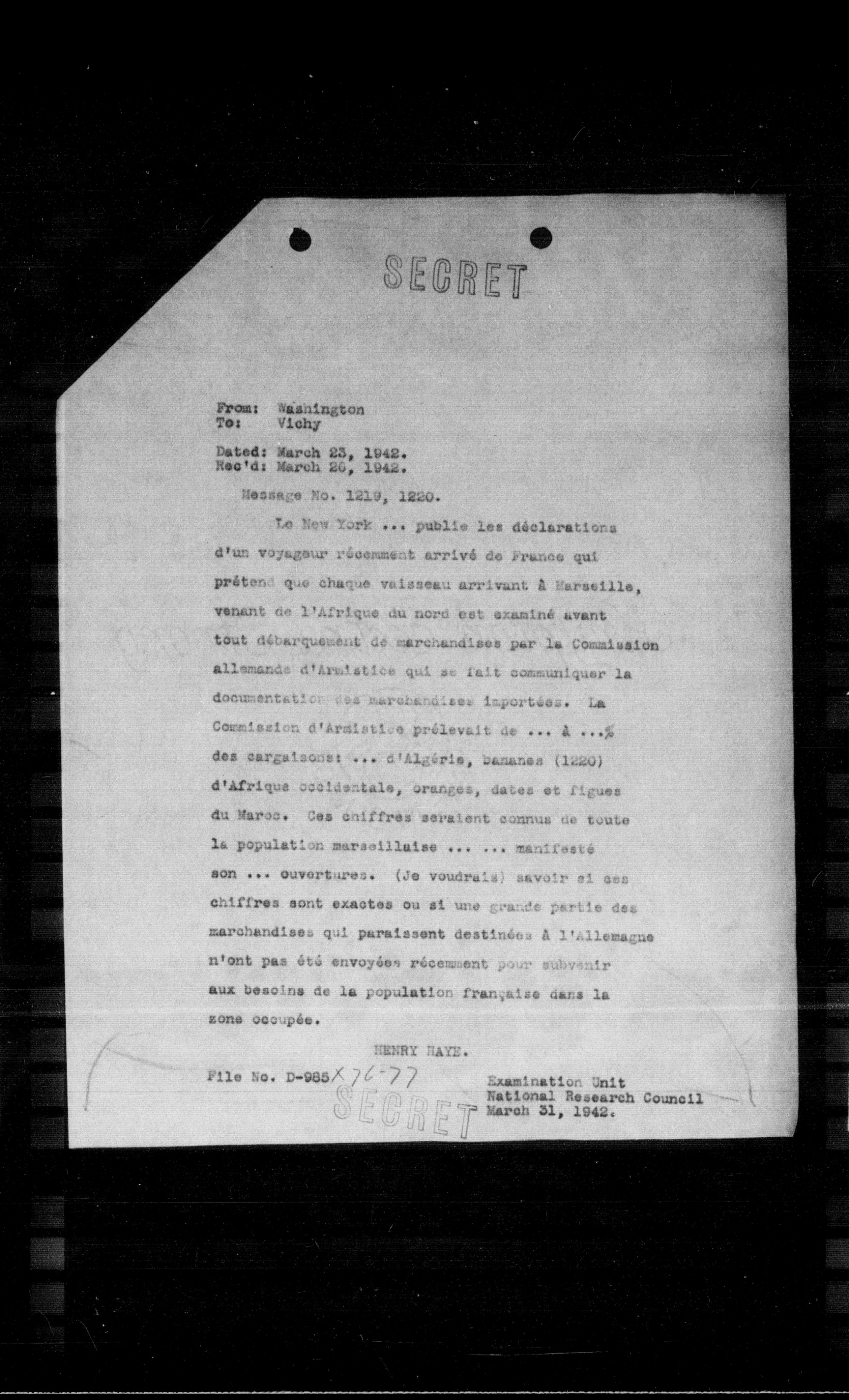 Le New York ... publie les déclarations d'un voyageur récemment arrivé de France qui prétend que chaque vaisseau arrivant à Marseille, venant de l'Afrique du nord est examiné avant tout débarquement de marchandises par la Commission allemande d'Armistice qui se fait communiquer la documentation des marchandises importées. La Commission d'Armistice prélevait de ... à ... des cargaisons: ... d'Algérie, bananes (1220) d'Afrique occidentale, oranges, dates et figues du Maroc. Ces chiffres seraient connus de toute la population marseillaise ... ... manifesté son ... ouvertures. (Je voudrais) savoir si ces chiffres sont exactes ou si une grande partie des marchandises qui paraissent destinées à l'Allemagne n'ont pas été envoyées récemment pour subvenir aux besoins de la population française dans la zone occupée.