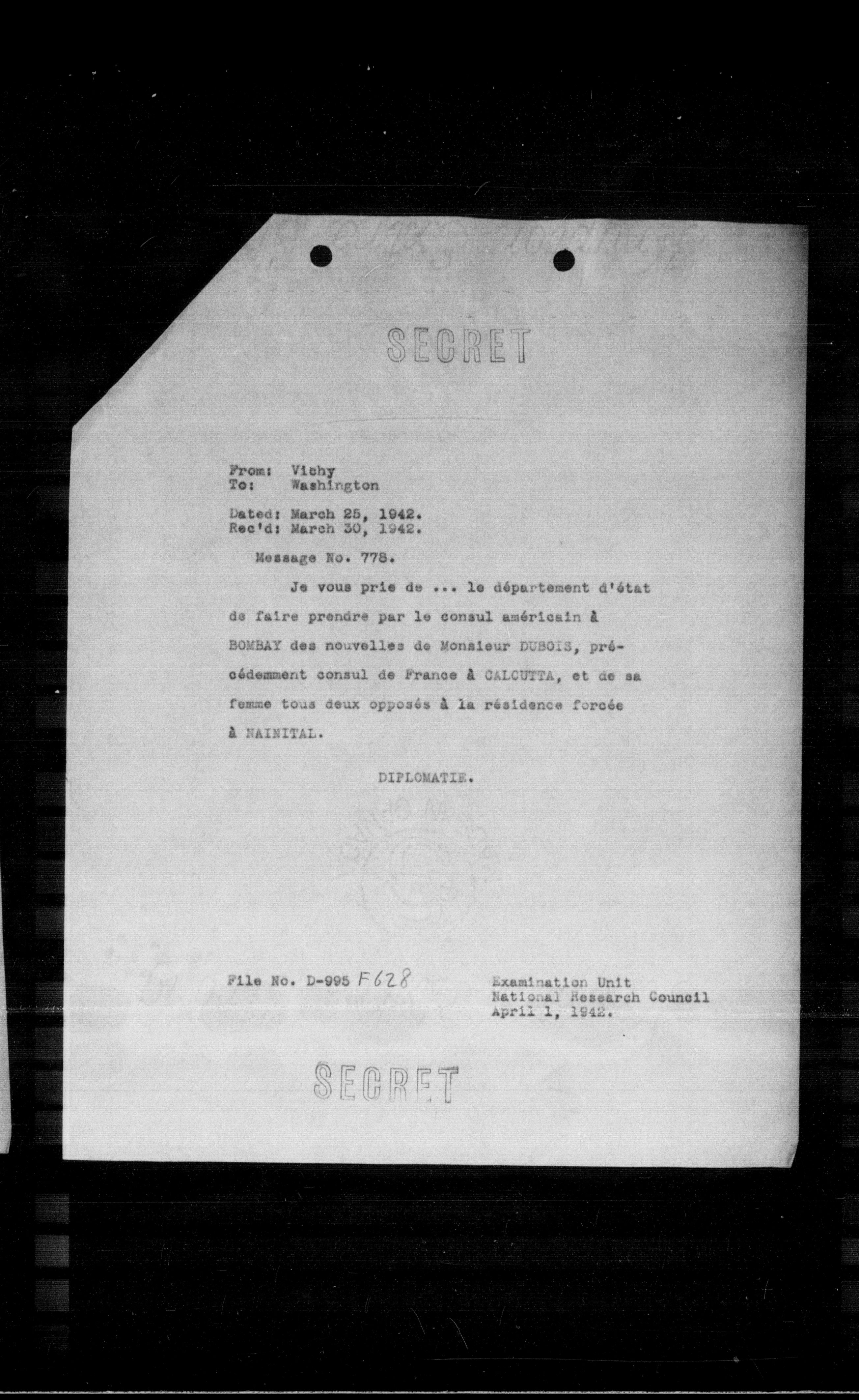 Je vous prie de ... le département d'état de faire prendre par le consul américain à BONBAY des nouvelles de Monsieur DUBOIS, précédemment consul de France à CALCUTTA, et de sa femme tous deux opposés à la résidence forcée à NAINITAL.